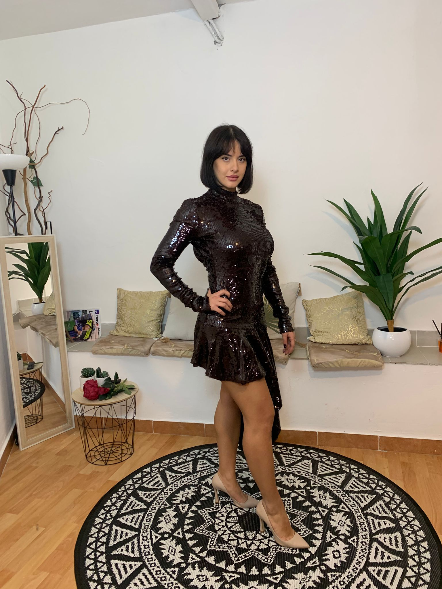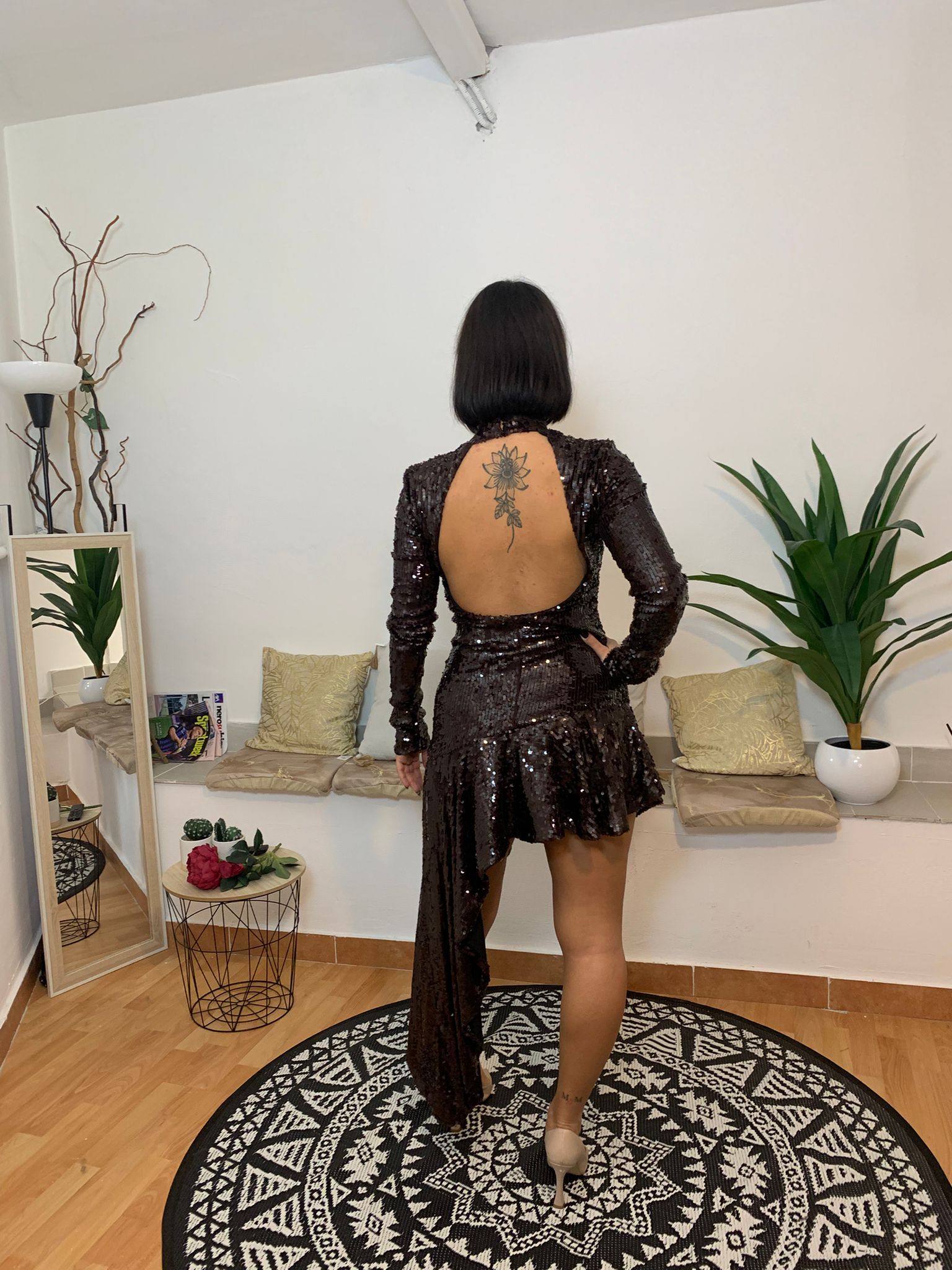 Abito Aniye By in tessuto marrone brillantinato con dettagli sofisticati: schiena scoperta elegante, scollatura laterale posizionata strategicamente e drappeggio asimmetrico che crea movimento. Collo alto con fodera interna morbida per il massimo comfort. Composizione: 93% poliestere, 7% elastan per una vestibilità ottimale. La modella indossa taglia 40 (altezza 170 cm, peso 52 kg).