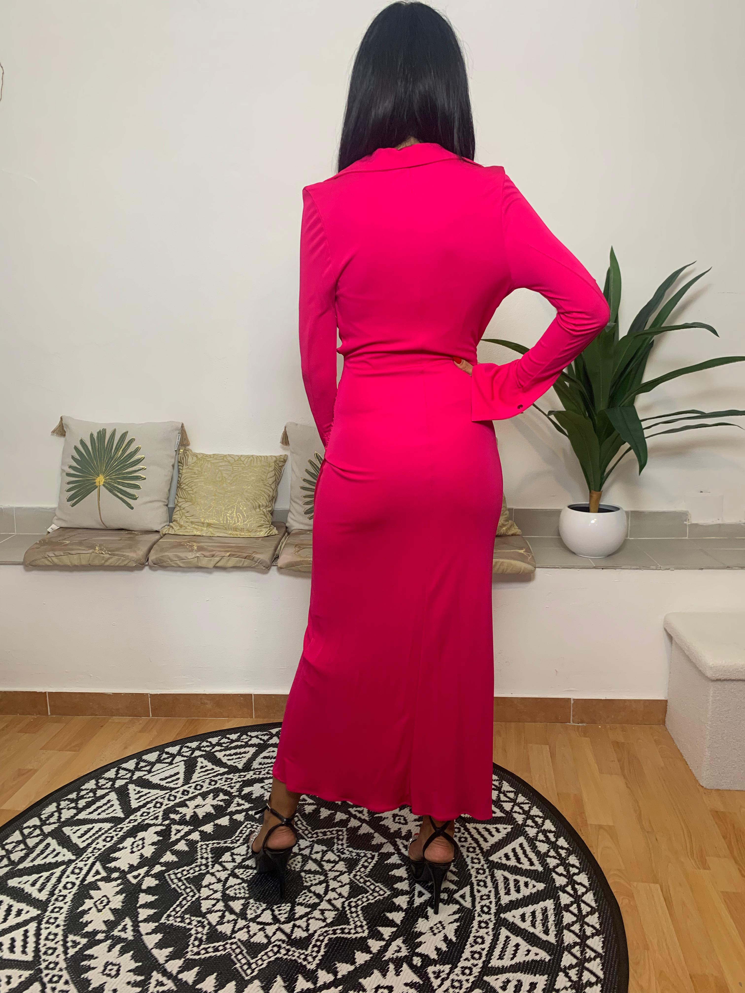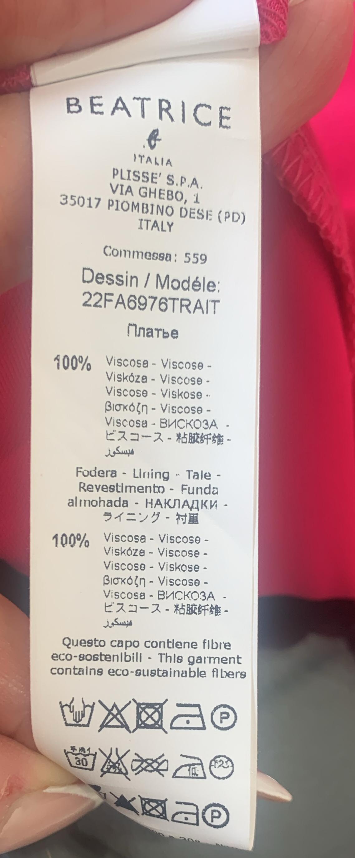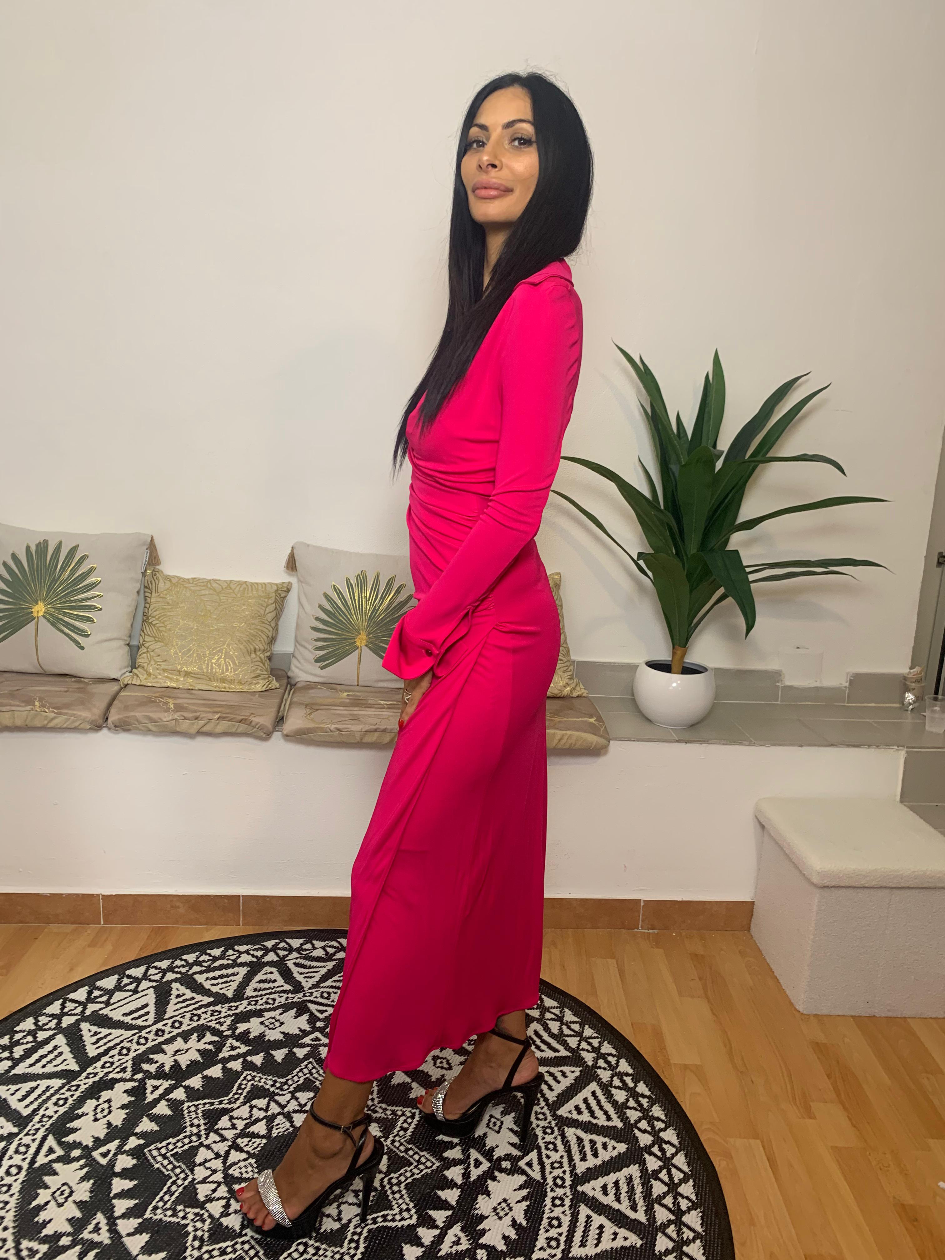 Beatrice B, celebre per i suoi tessuti leggeri e fluidi, presenta questo abito fuxia che avvolge delicatamente la silhouette con un effetto incrociato e un collo camicia caratterizzato da un dettaglio arricciato sul lato. L’outfit è completato da una sottoveste coordinata dello stesso colore. La modella indossa una taglia 42, è alta 175 cm e pesa 54 kg. Composizione: 100% viscosa.