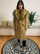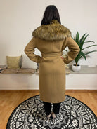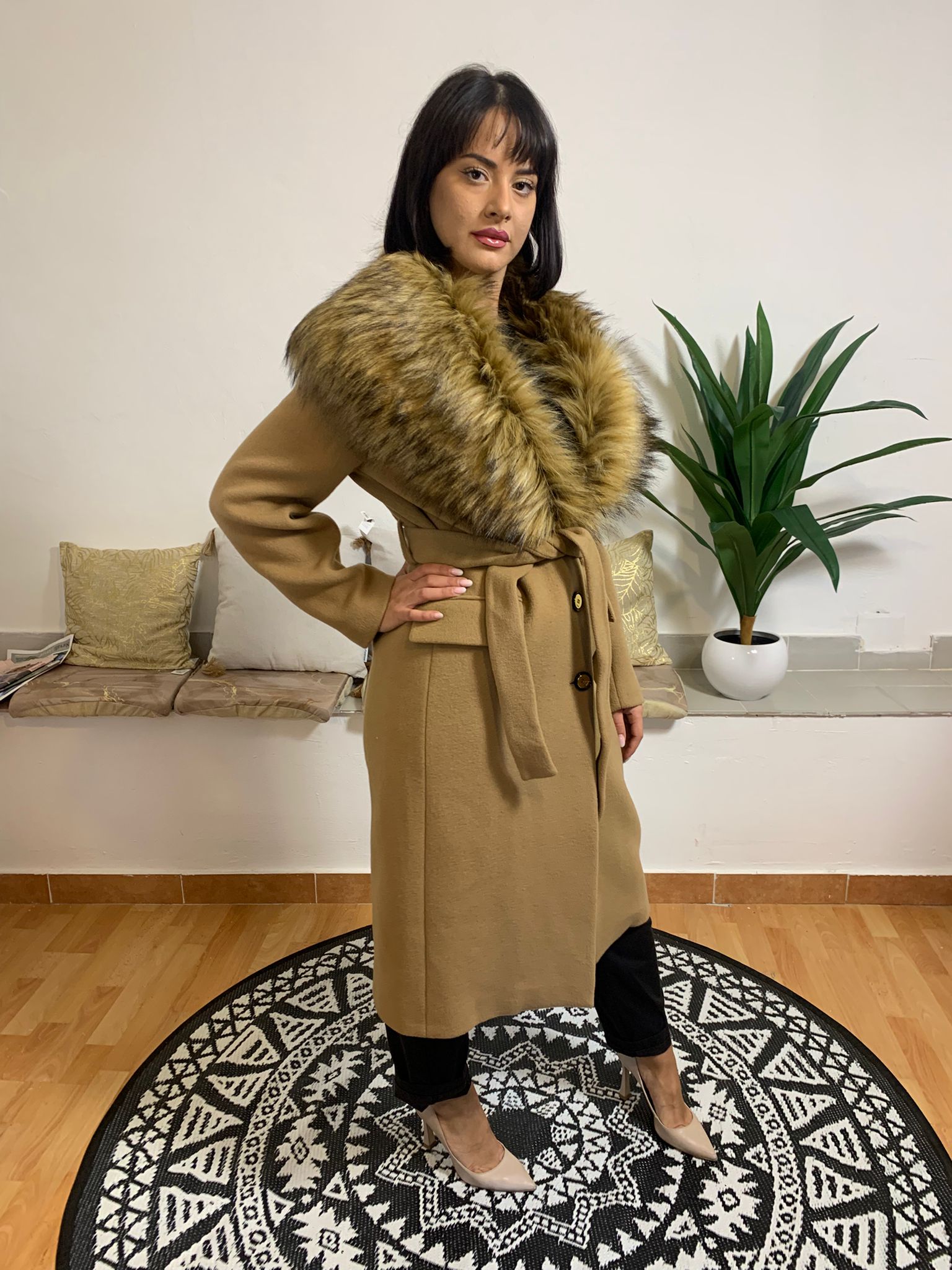 PINKO presenta un capo dalla texture molto soffice, realizzato con una significativa percentuale di lana vergine. Il cappotto include una pelliccia integrata, fissa e non rimovibile, con una lunghezza pensata per adattarsi a molteplici outfit. La chiusura si distingue per i raffinati bottoni logati e la cintura coordinata. Composizione: 75% lana vergine, 25% poliammide. La modella, con un'altezza di 170 cm e un peso di 62 kg, indossa una taglia S.