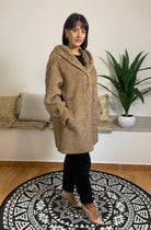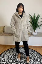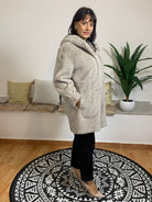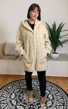PELLICCIA PEGGY HO è realizzata in ecopelliccia 100% poliestere, perfetta per affrontare l’inverno grazie alla sua maggiore lunghezza e alla silhouette più ampia rispetto ai modelli convenzionali. Include un cappuccio integrato e una chiusura con graffette nascoste per un look elegante e funzionale. Il capo indossato dalla modella è una taglia M; lei è alta 170 cm e pesa 62 kg.
