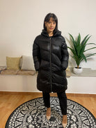 GIUBBINO TOY G è un giubbotto lungo dotato di cappuccio e di tasche con chiusura a zip, analogamente alla zip centrale. Realizzato al 100% in poliestere, è imbottito con ovatta per garantire comfort e calore. La modella ritratta pesa 62 kg ed è alta 170 cm.