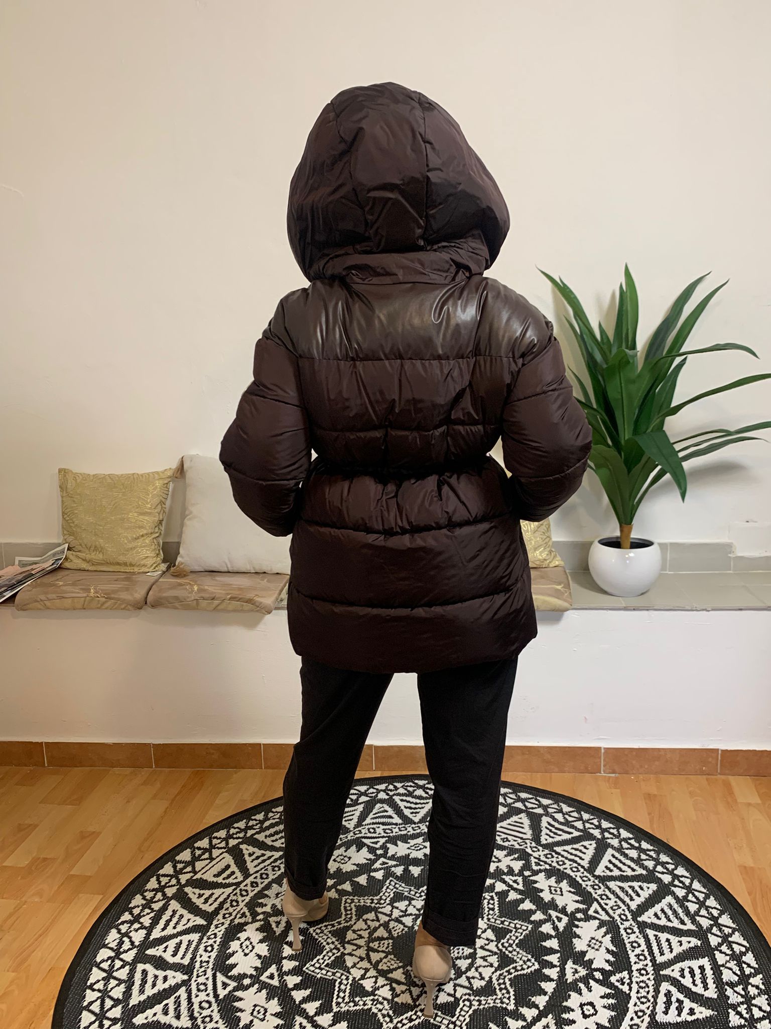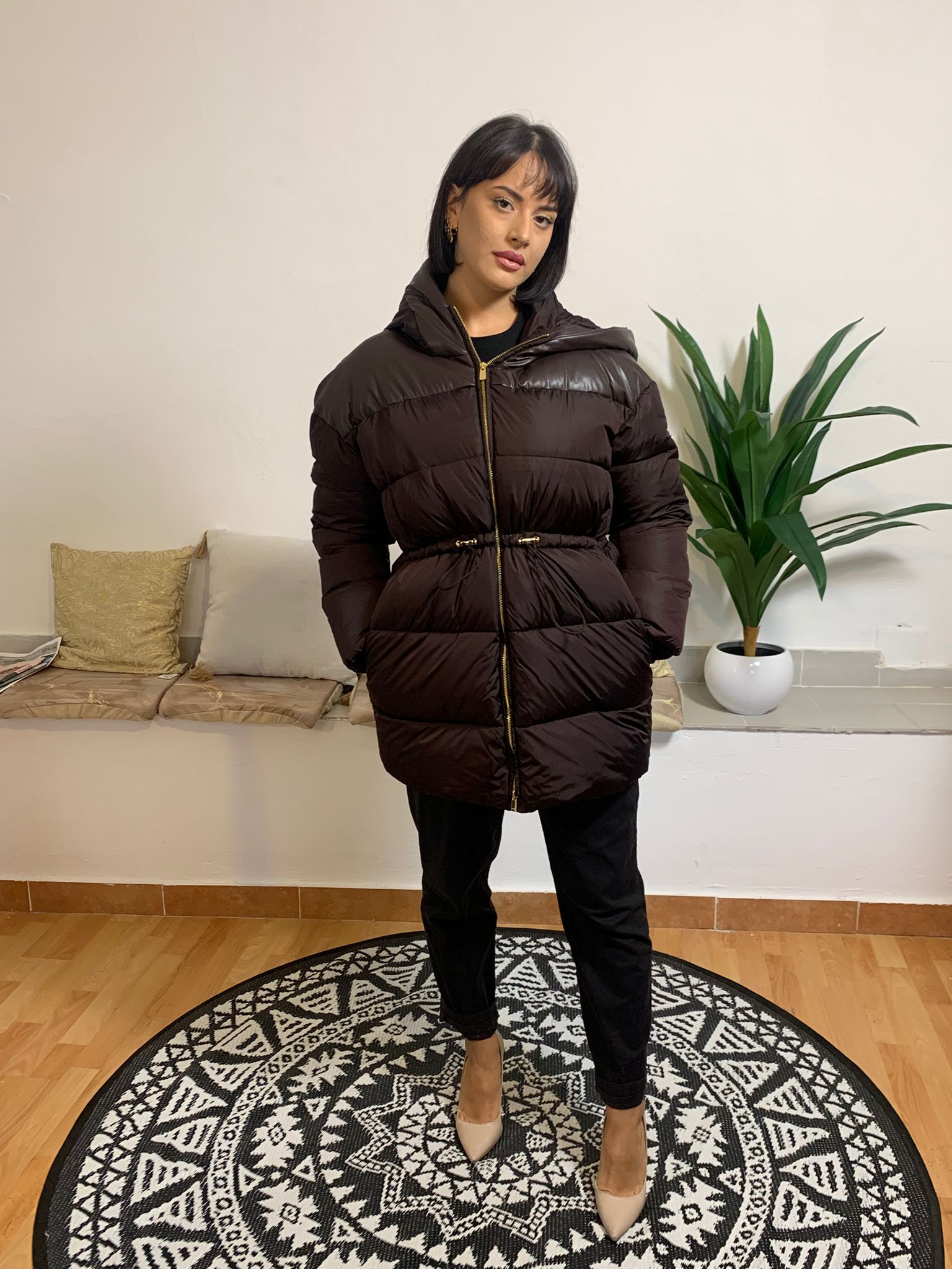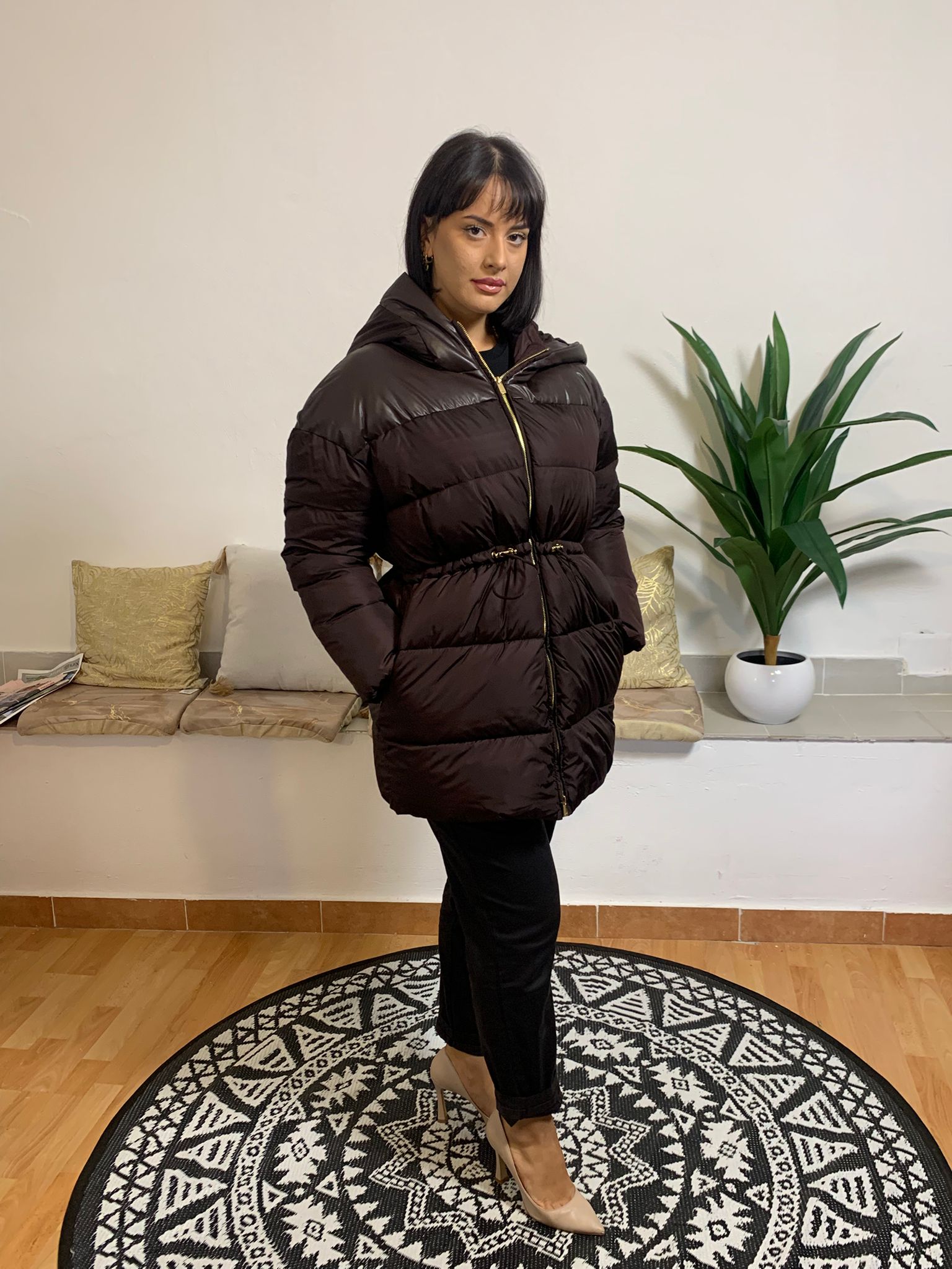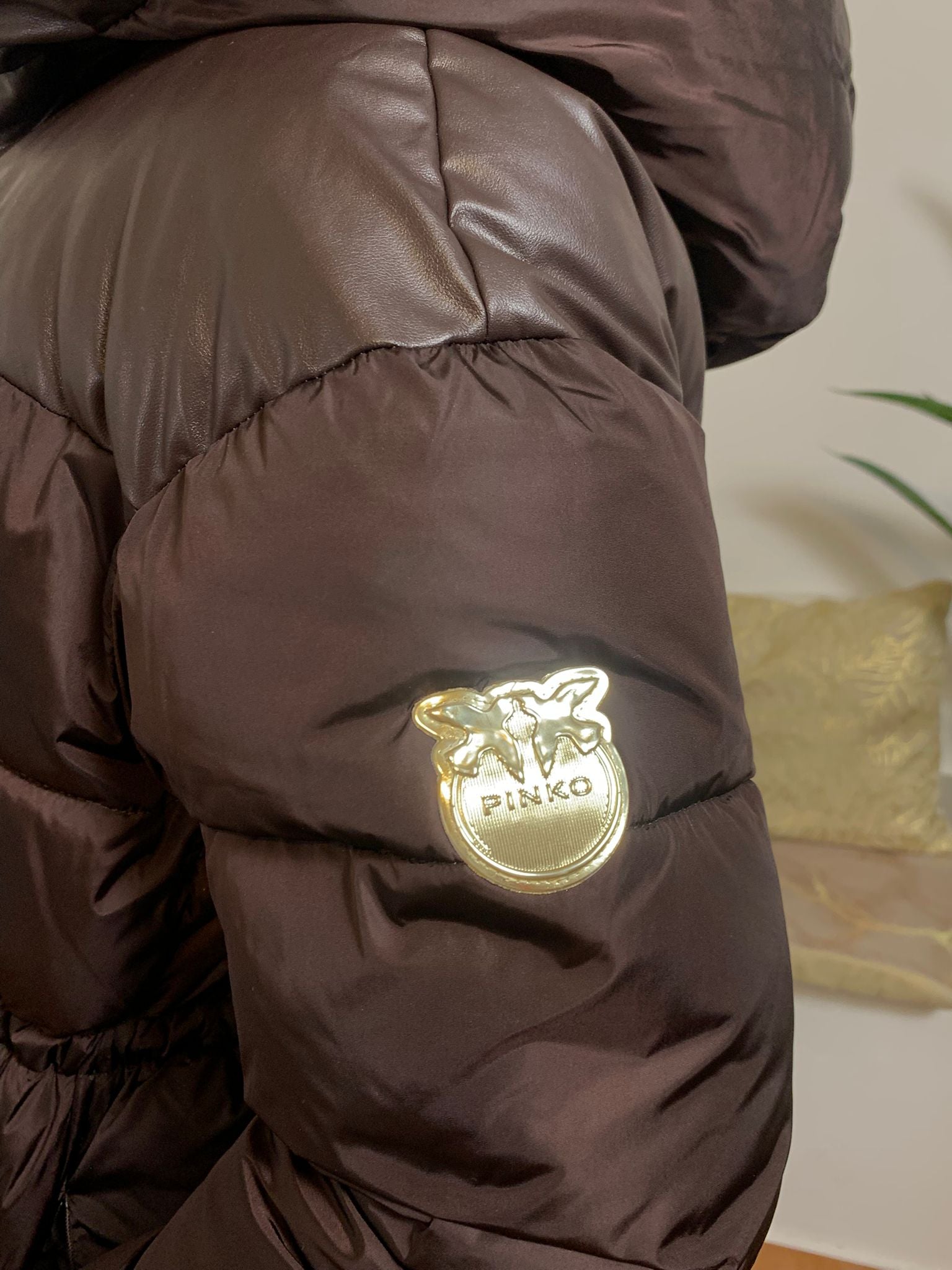 Il giubbino Pinko presenta una raffinata combinazione di materiali con una parte superiore in similpelle marrone che si fonde elegantemente con il tessuto lungo il resto del capo. Differenziandosi dai modelli tradizionali, la sua lunghezza maggiore offre una linea moderna e avvolgente. Completa il design la presenza di due lacci dorati per una regolazione ottimale, mentre il cappuccio è rifinito con dettagli in similpelle, aggiungendo un tocco di pregio e funzionalità in più abbiamo la presenza del logo in oro.La modella pesa 62kg ed è alta 170 cm