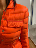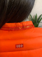 Giubbotto arancione Via delle Perle caratterizzato da una cintura regolabile che valorizza la vita, arricchita da dettagli arricciati e bottoni a cerchio sul davanti. Le tasche con zip sono impreziosite da un brillante, mentre tasche decorative con scintillii tonalmente coordinati completano il design. Presenta inoltre un colletto definito e il logo del marchio sul retro. La modella misura 175 cm ed è rifinito in 100% poliammide.