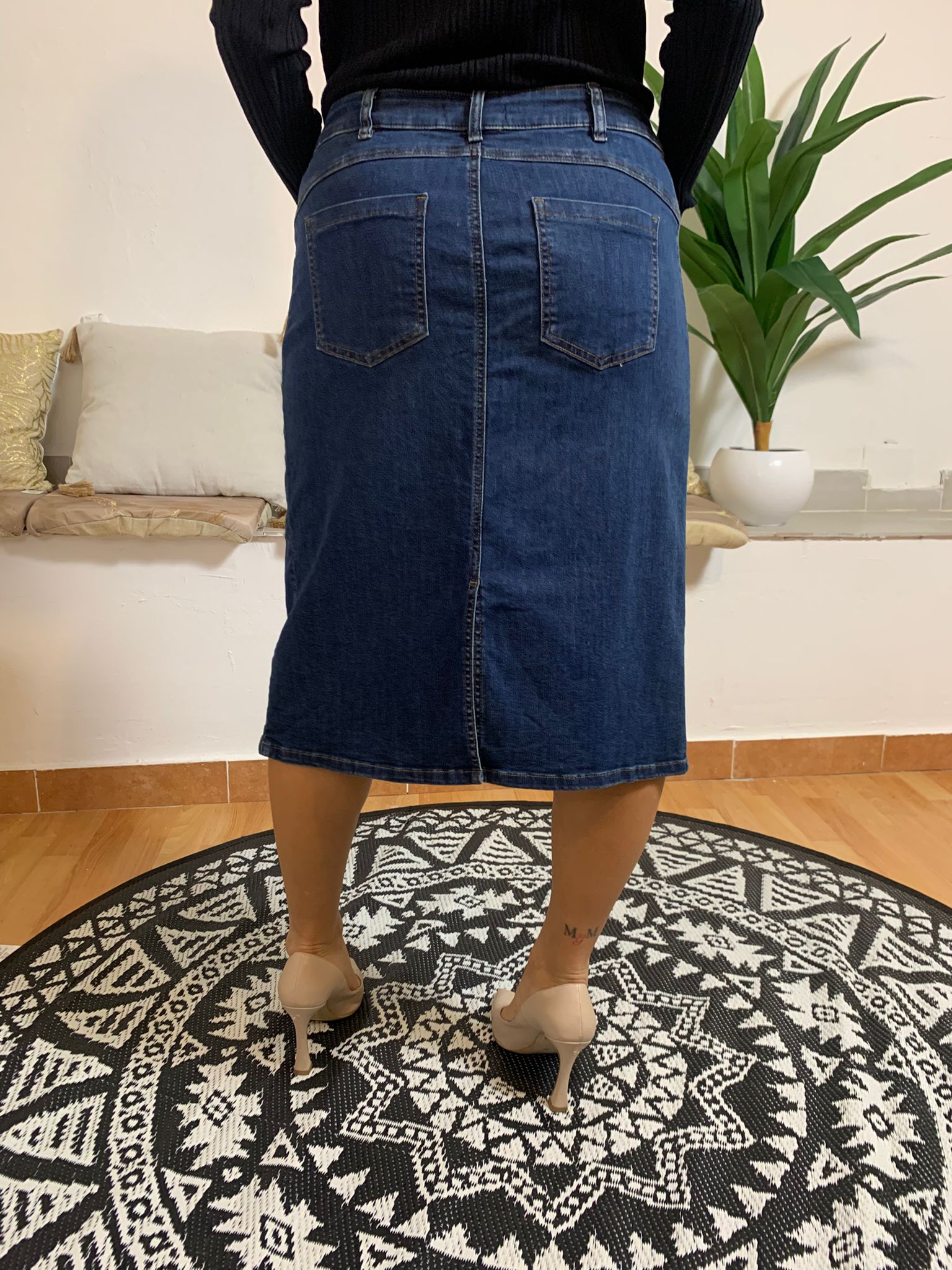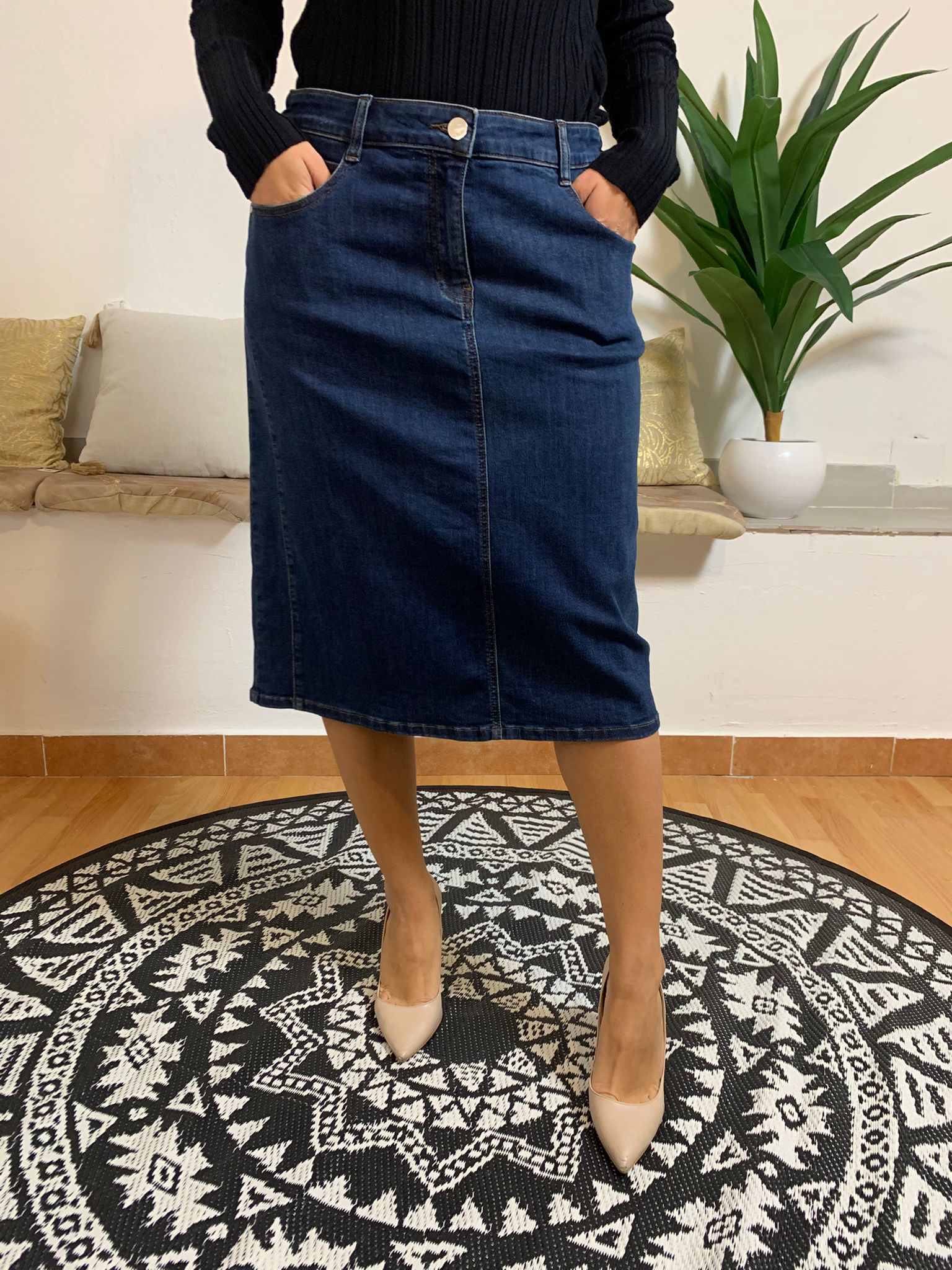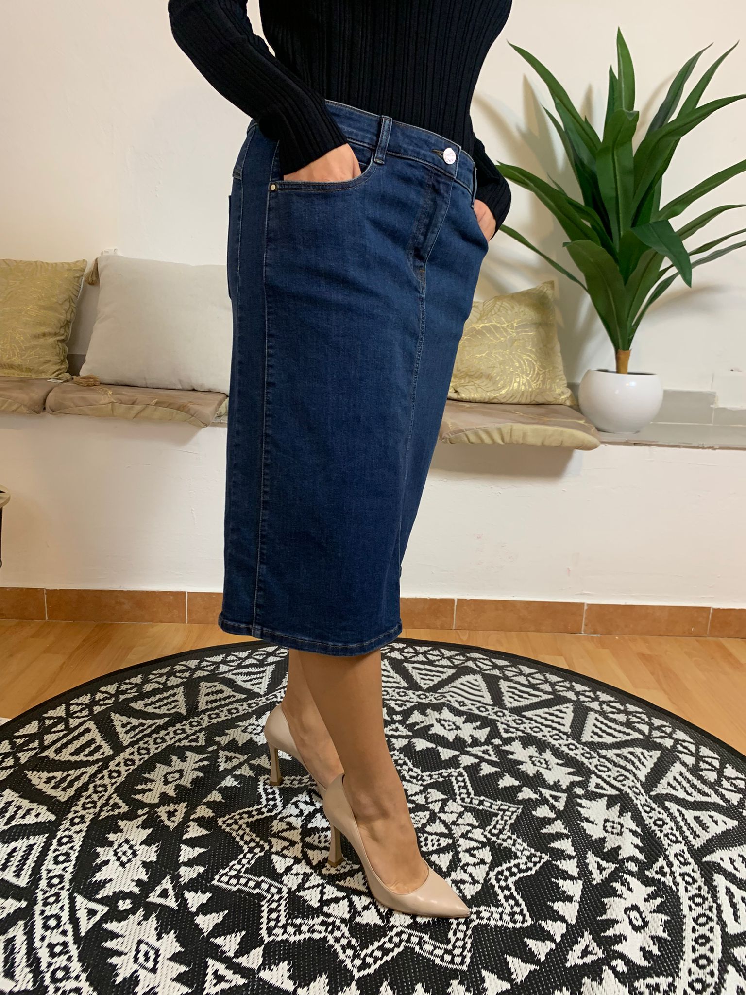 Gonna in denim Elena Mirò che scende fino sotto il ginocchio, caratterizzata da tasche funzionali e chiusura con bottone e cintura. Presenta un delicato spacco frontale che aggiunge movimento al capo. Realizzata in pregiato blend di cotone 74%, poliestere 24% ed elastan 2%, garantisce comfort e vestibilità ottimale. La modella indossa la taglia 46, con altezza 170 cm e peso 62 kg.
