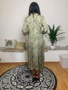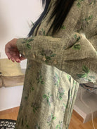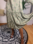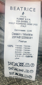 L’abito Beatrice B. Grazionso è caratterizzato da un collo camicia con bottoncini che si estendono quasi fino a metà, mantenendo una linea dritta che si interrompe presso la gonna, dove si crea un delicato arricciamento a balza. I polsini lunghi sono impreziositi da quattro bottoni. La fantasia esclusiva richiama l’effetto di un dipinto artistico. La modella, alta 175 cm e 54 kg, indossa una taglia 38. Realizzato al 100% in viscosa, assicura una vestibilità confortevole e una caduta elegante.