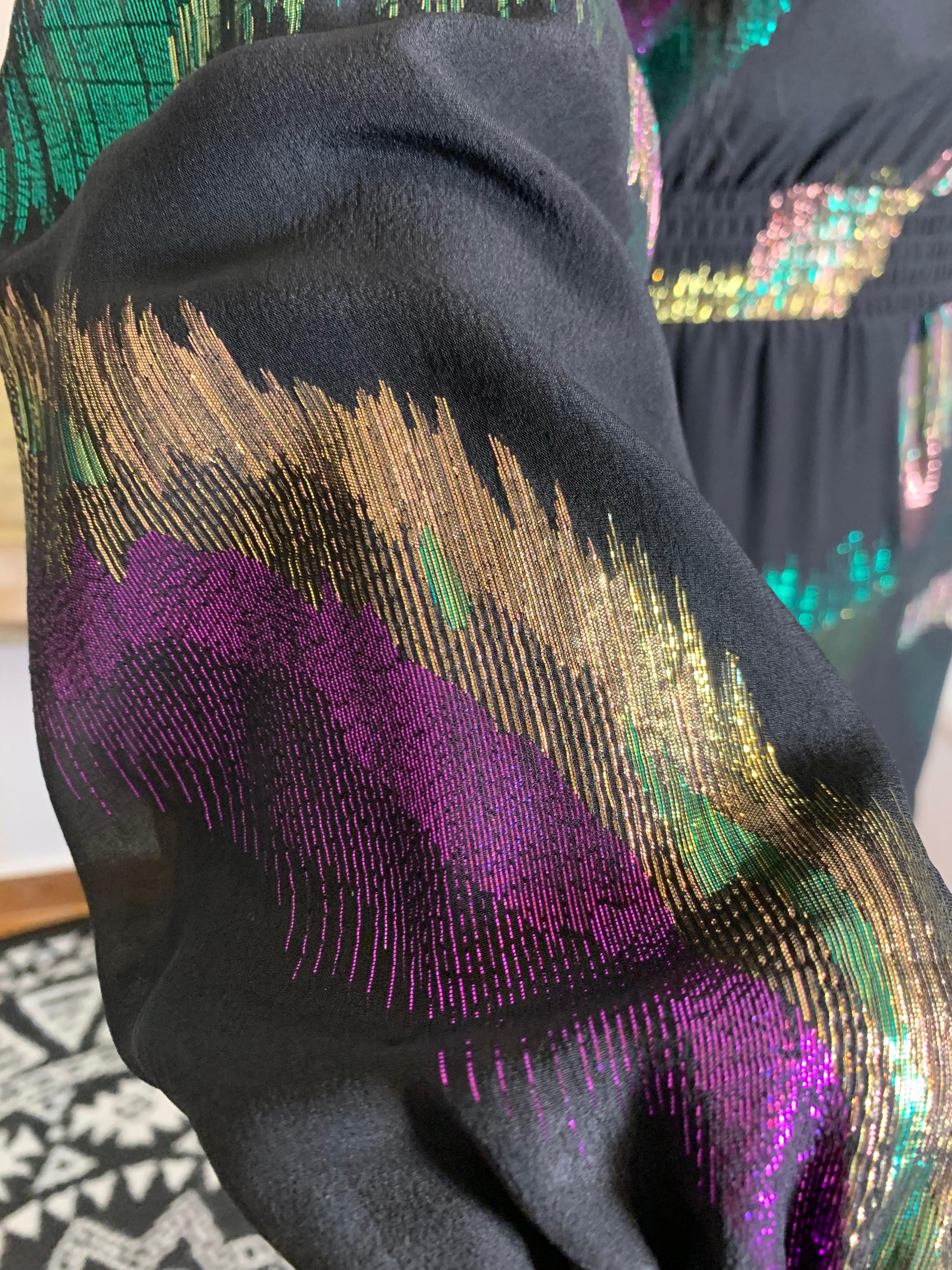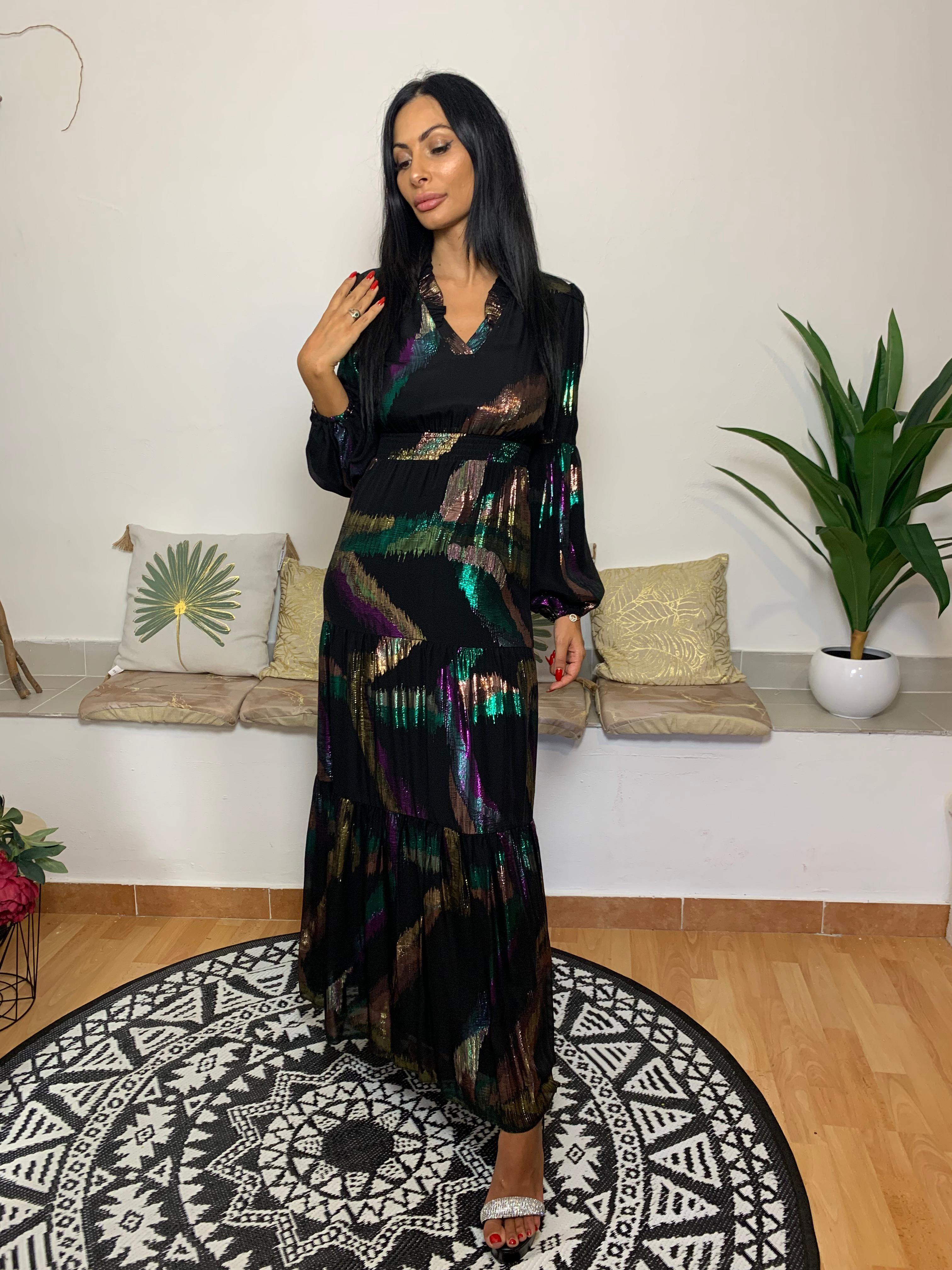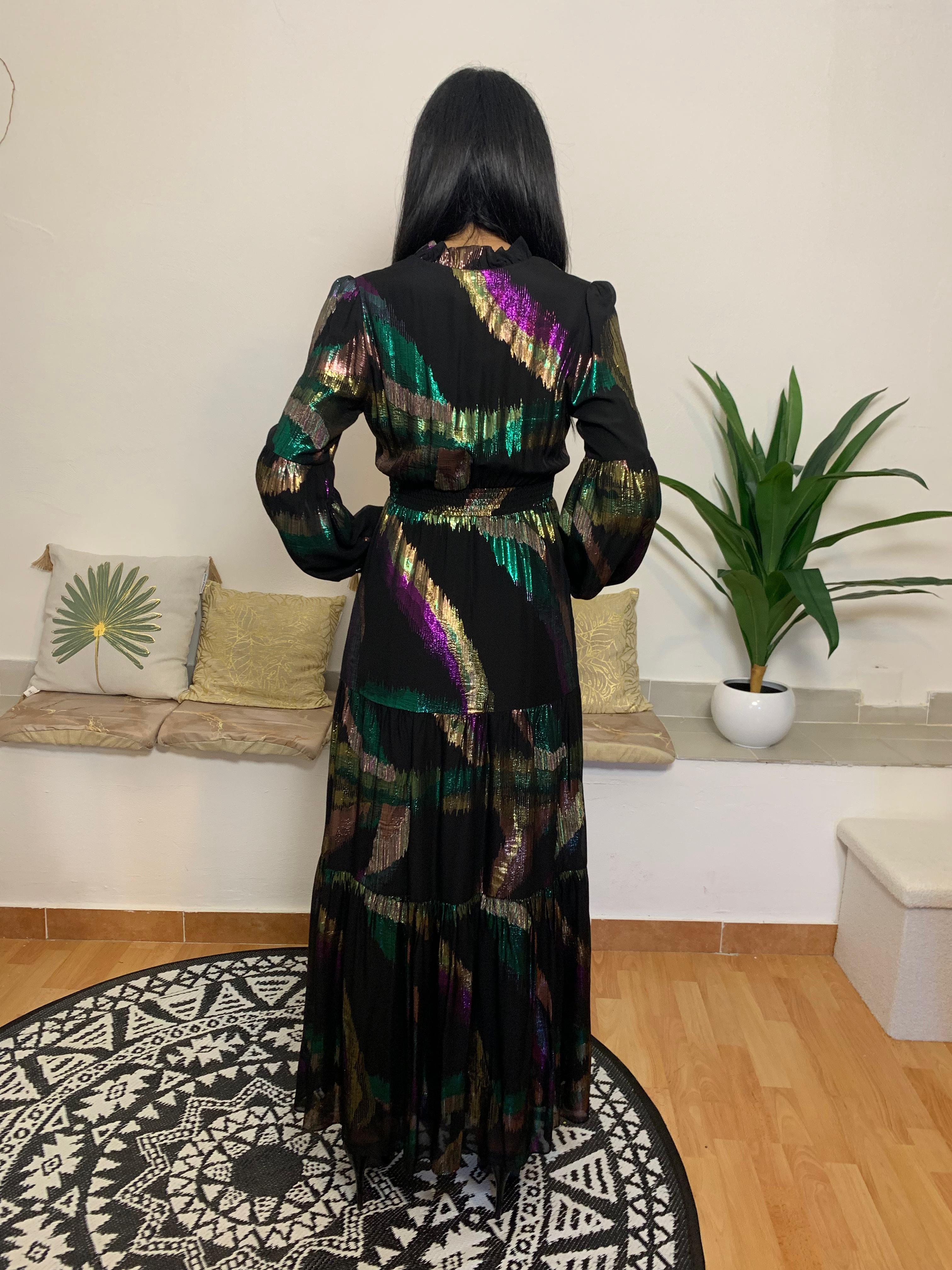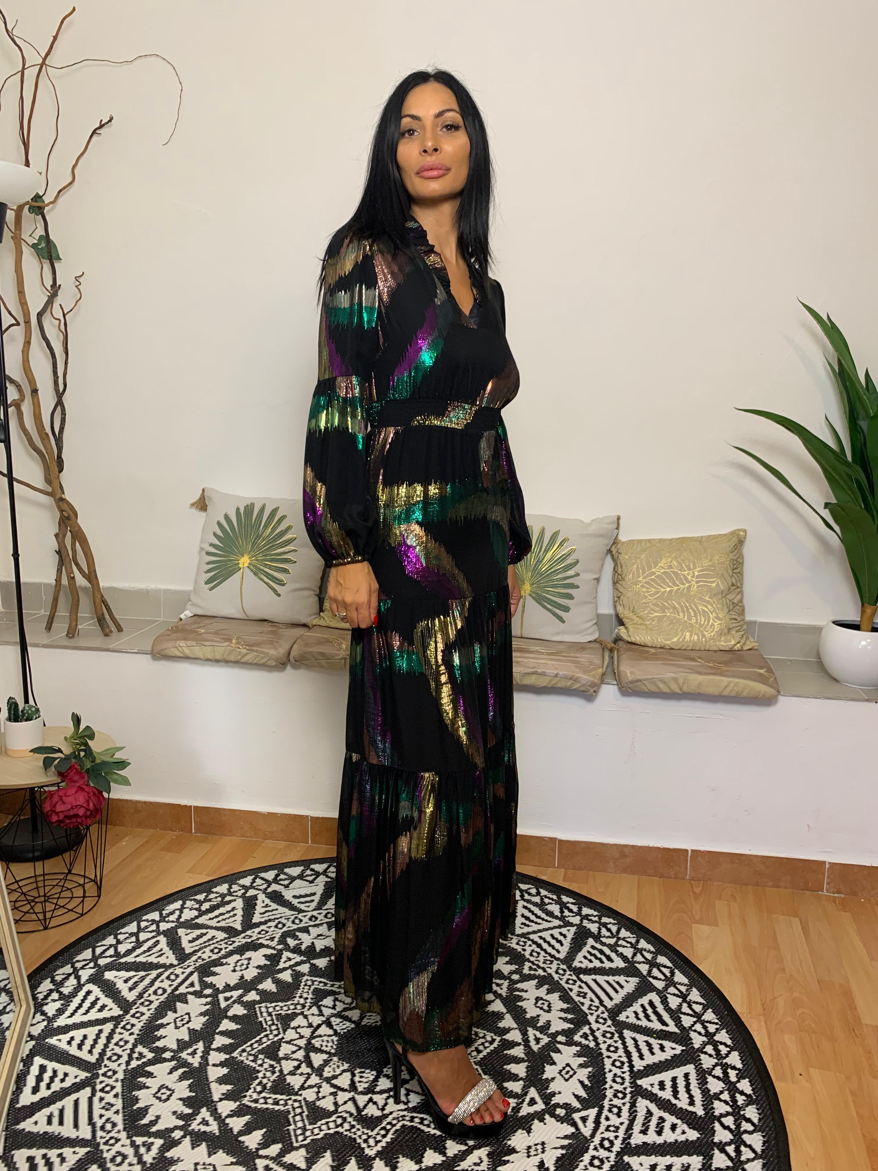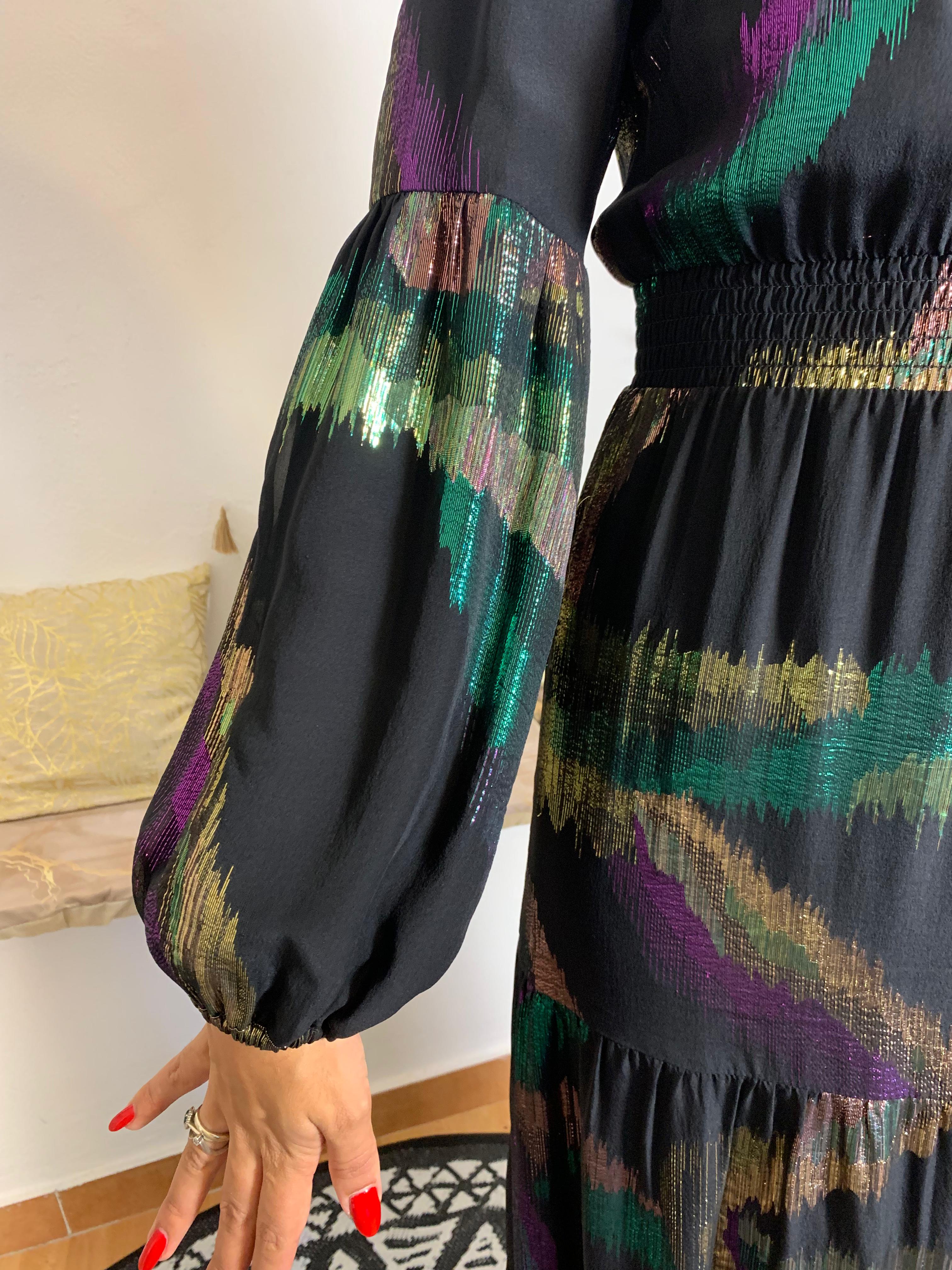NENETTE ha creato questo elegante abito lungo con grande attenzione ai dettagli: scollo a V arricchito da arricciature, vita elasticizzata per valorizzare la silhouette, maniche aderenti fino al gomito che si trasformano in un delicato effetto balloon. La gonna termina con una raffinata balza che dona movimento. Il tessuto, un pregiato mix di 80% seta e 20% fibra metallica, conferisce una fluidità e una luminosità uniche al colore. La fodera, realizzata con cura in 100% poliestere, assicura comfort e vestibilità impeccabile. Modella alta 175 cm, indossa taglia 40.
