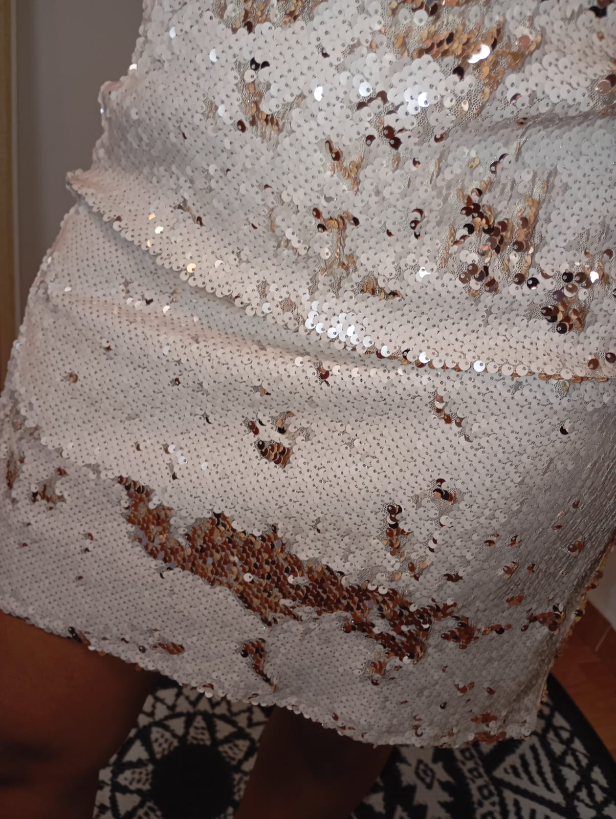 Atelier Lagora propone un abito beige aderente decorato con paillettes che al tatto mutano riflesso tra avorio e oro. Il capo presenta maniche lunghe, scollo girocollo, una linea che segue la silhouette e una zip posteriore. La modella, alta 170 cm e dal peso di 54 kg, indossa una taglia 46. Realizzato interamente in poliestere, questo abito unisce raffinatezza e funzionalità.