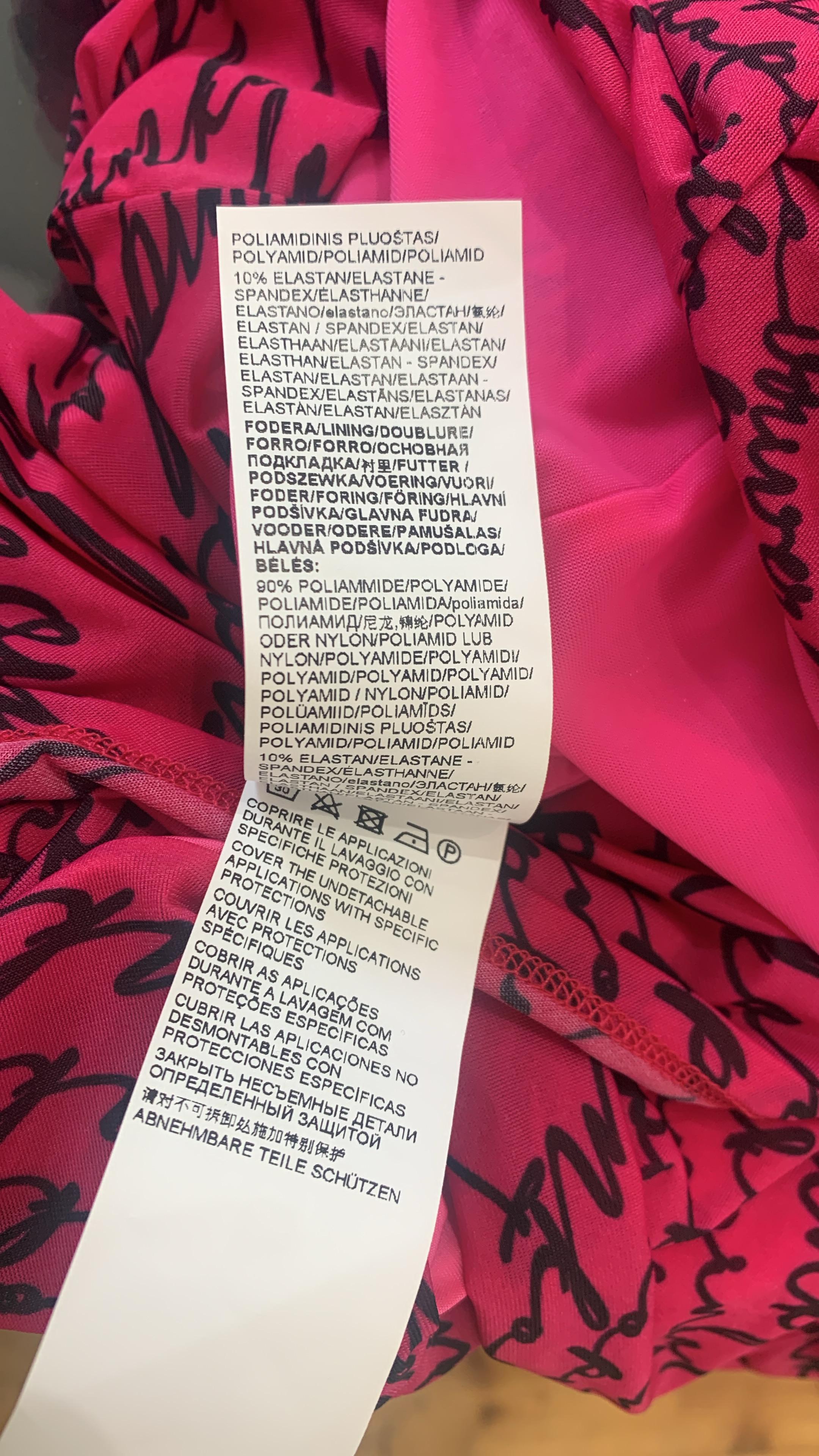 PINKO. Miniabito in tessuto elasticizzato e morbido, caratterizzato da una zip frontale con arricciatura, da una seconda arricciatura sotto il seno e da un'apertura sulla spalla. Il capo è decorato con scritte Pinko che coprono l'intera superficie. La modella indossa una taglia S, è alta 175 cm e pesa 54 kg. Composizione: 90% poliammide, 10% elastan.