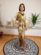 Beatrice B. propone un abito caratterizzato da un taglio distintivo, collo morbido e maniche a mezz’aria dal profilo fluido simile a quelle a pipistrello. La vestibilità prevede un taglio in vita che si apre leggermente con una gonna leggermente svasata. La modella, alta 170 cm e del peso di 62 kg, indossa una taglia 46. Realizzato interamente in viscosa al 100%.