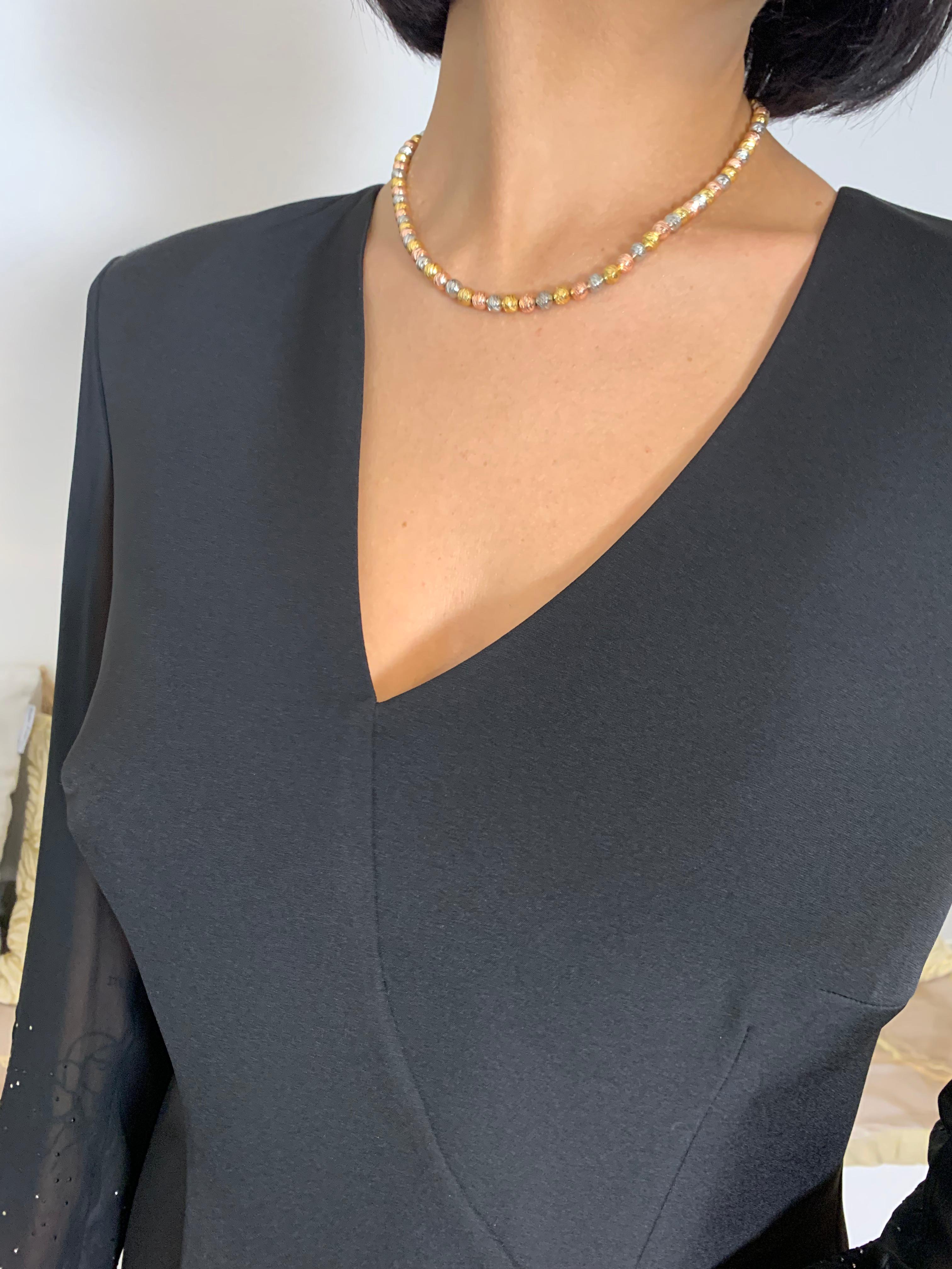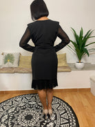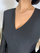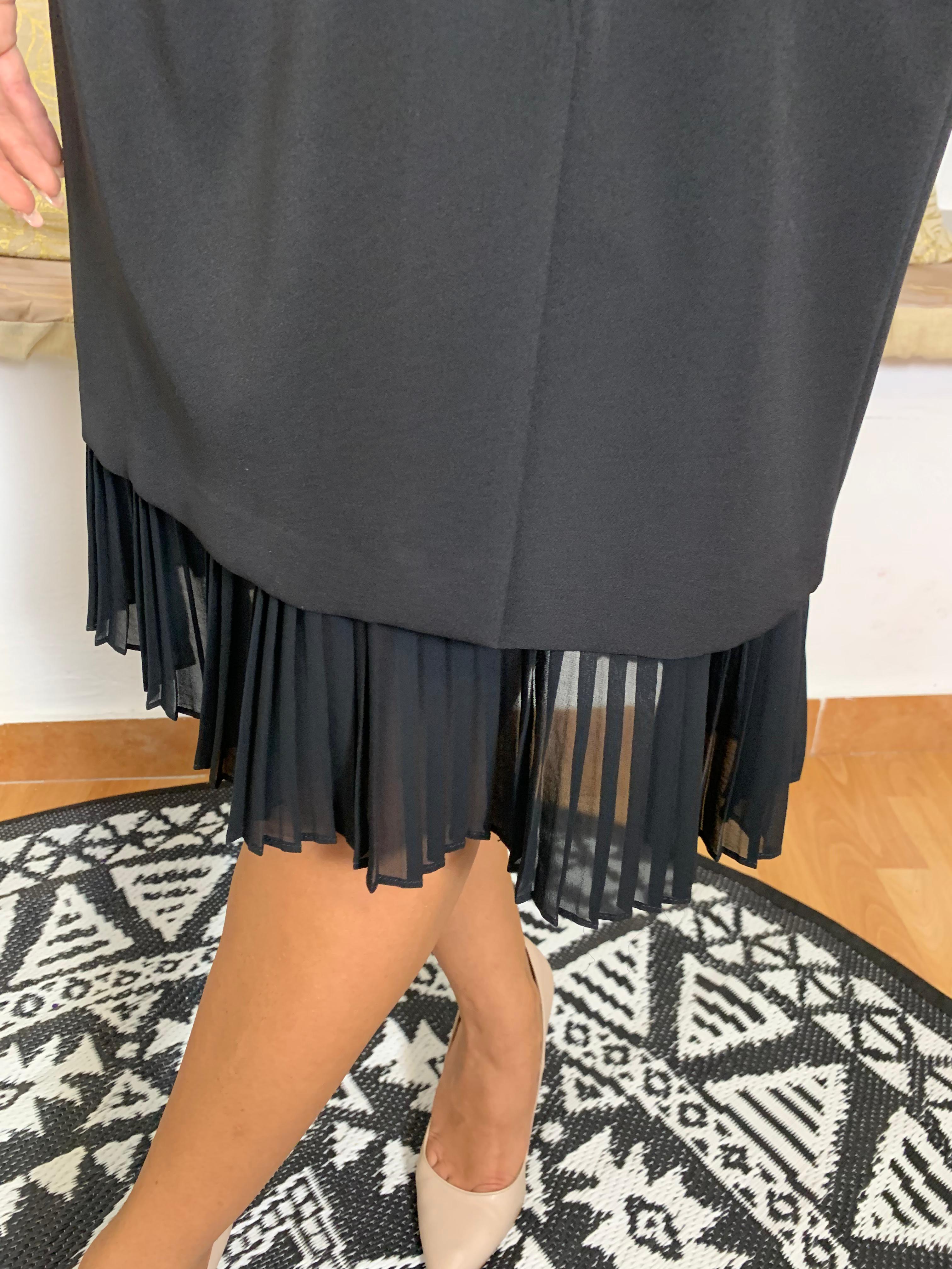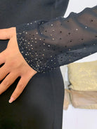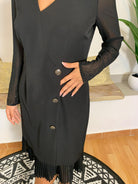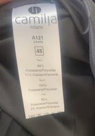 Abito elegante firmato Camilla Milano, caratterizzato da una scollatura femminile e raffinata allo stesso tempo. La manica è leggermente velata e impreziosita da strass sul finale. Davanti presenta tre bottoni che creano un effetto portafoglio, mentre la gonna si conclude con un delicato velo plissé. La modella indossa una taglia 48, è alta 170 cm e pesa 62 kg. Tessuto esterno composto da 89% poliestere e 11% elastan.