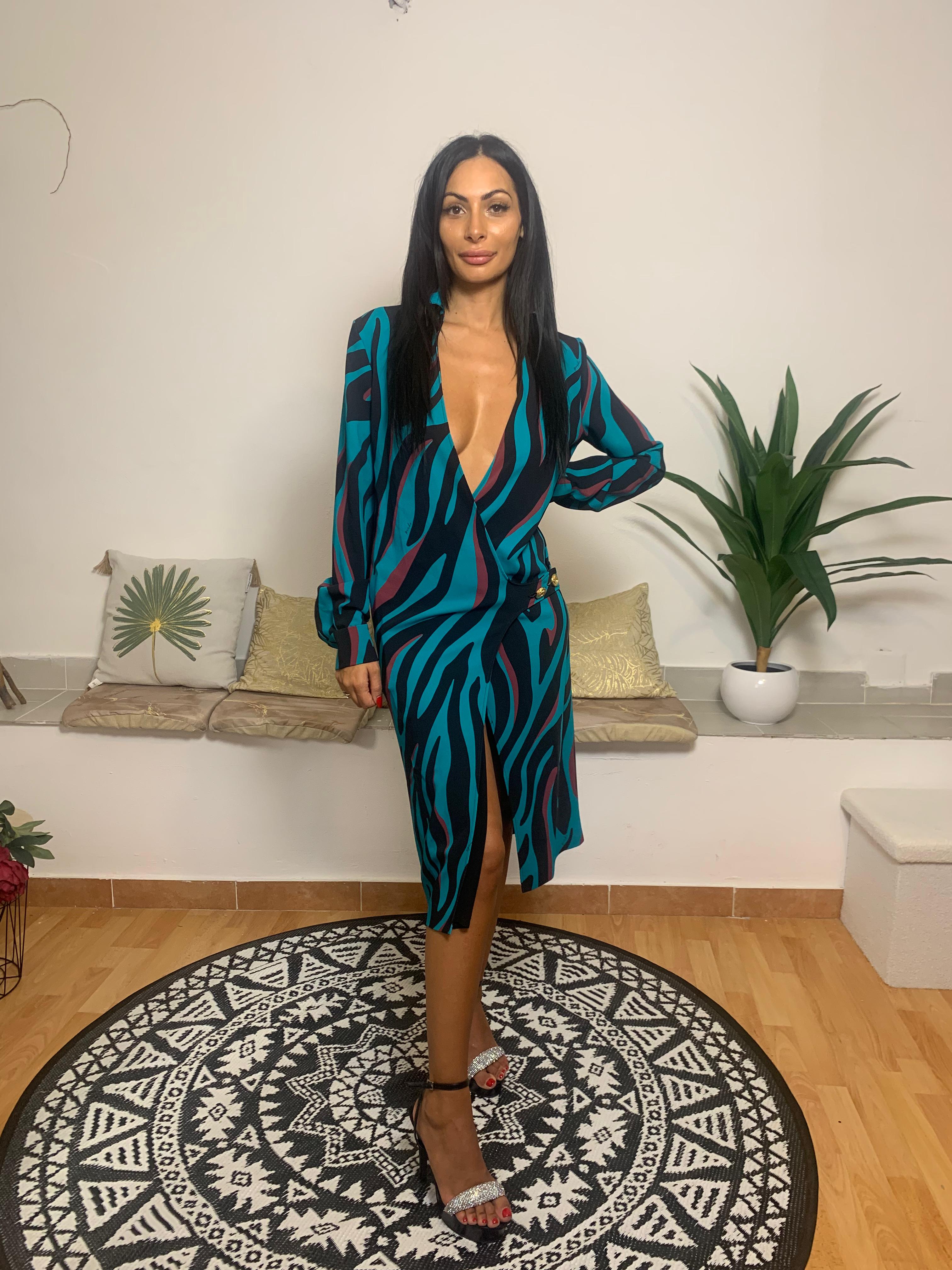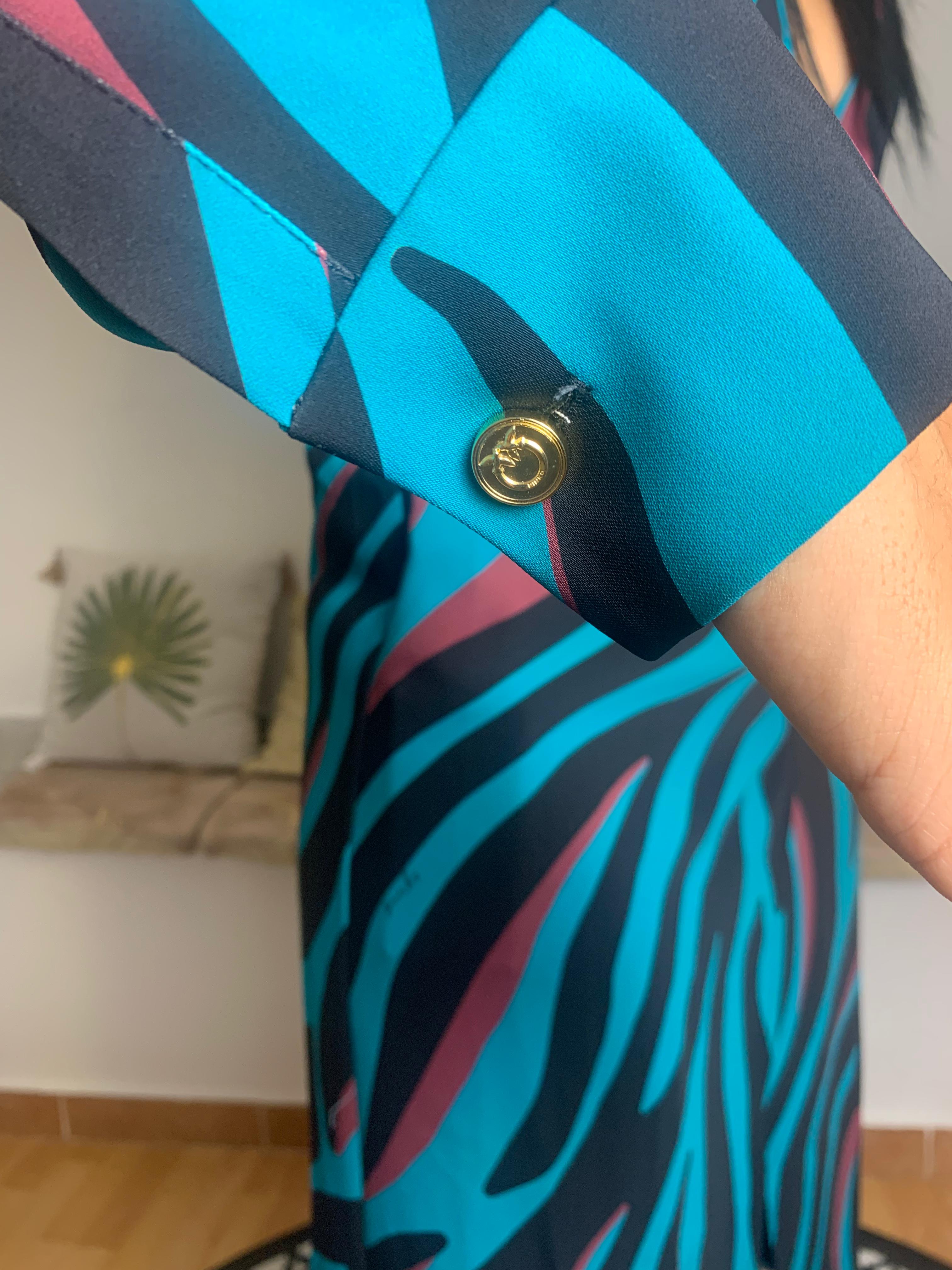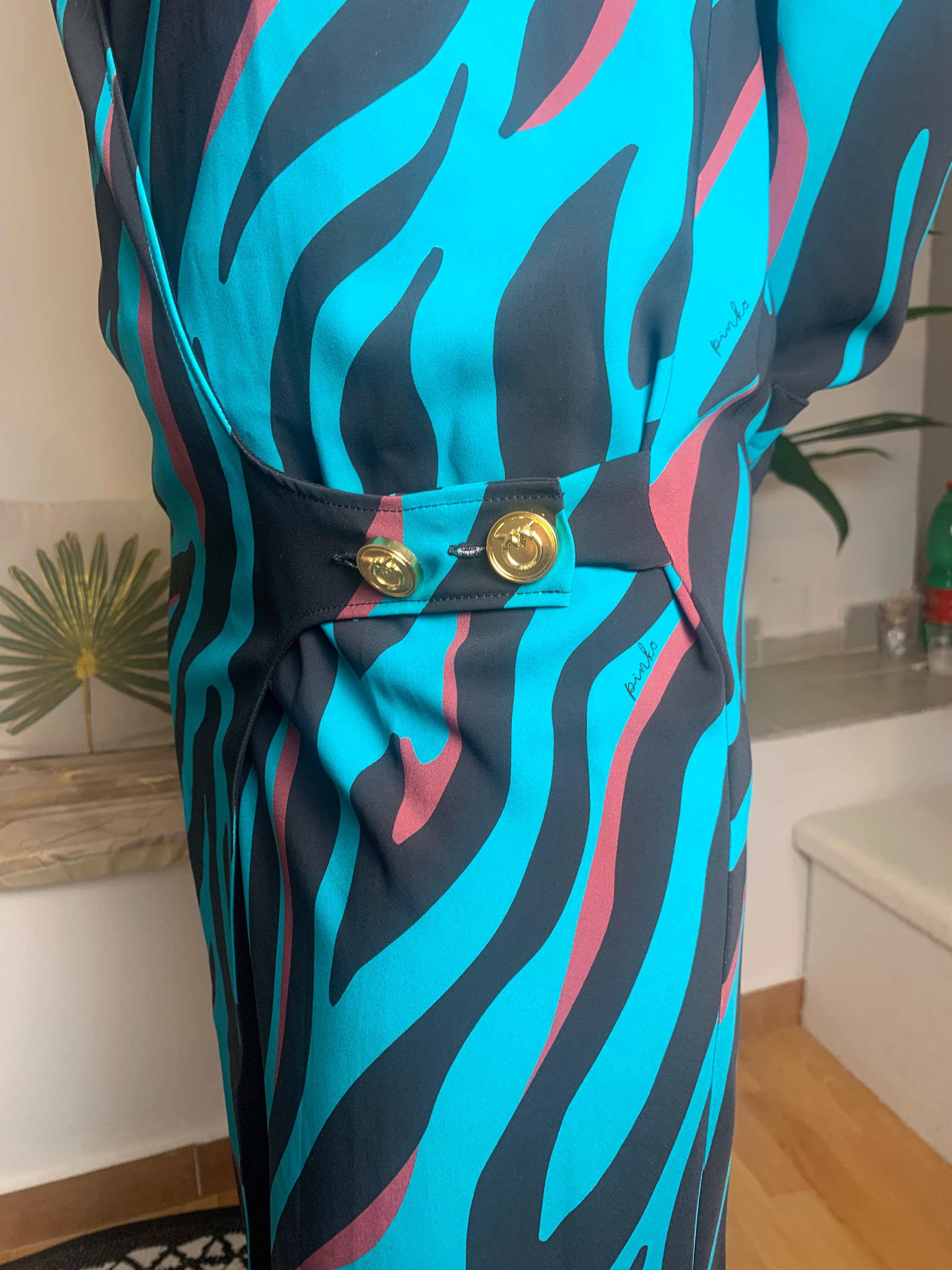 PINKO presenta un abito che combina versatilità, fantasia, lunghezza perfetta e sensualità. Il modello è caratterizzato da un colletto camicia e una chiusura incrociata con bottoni, offrendo una silhouette raffinata e unica. Questo abito si adatta a diverse occasioni: con tacchi risulta elegante, mentre abbinato a tronchetti o anfibi crea un look casual e originale. Realizzato interamente in poliestere, è indossato da una modella alta 175 cm, 54 kg, con taglia 38.