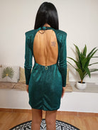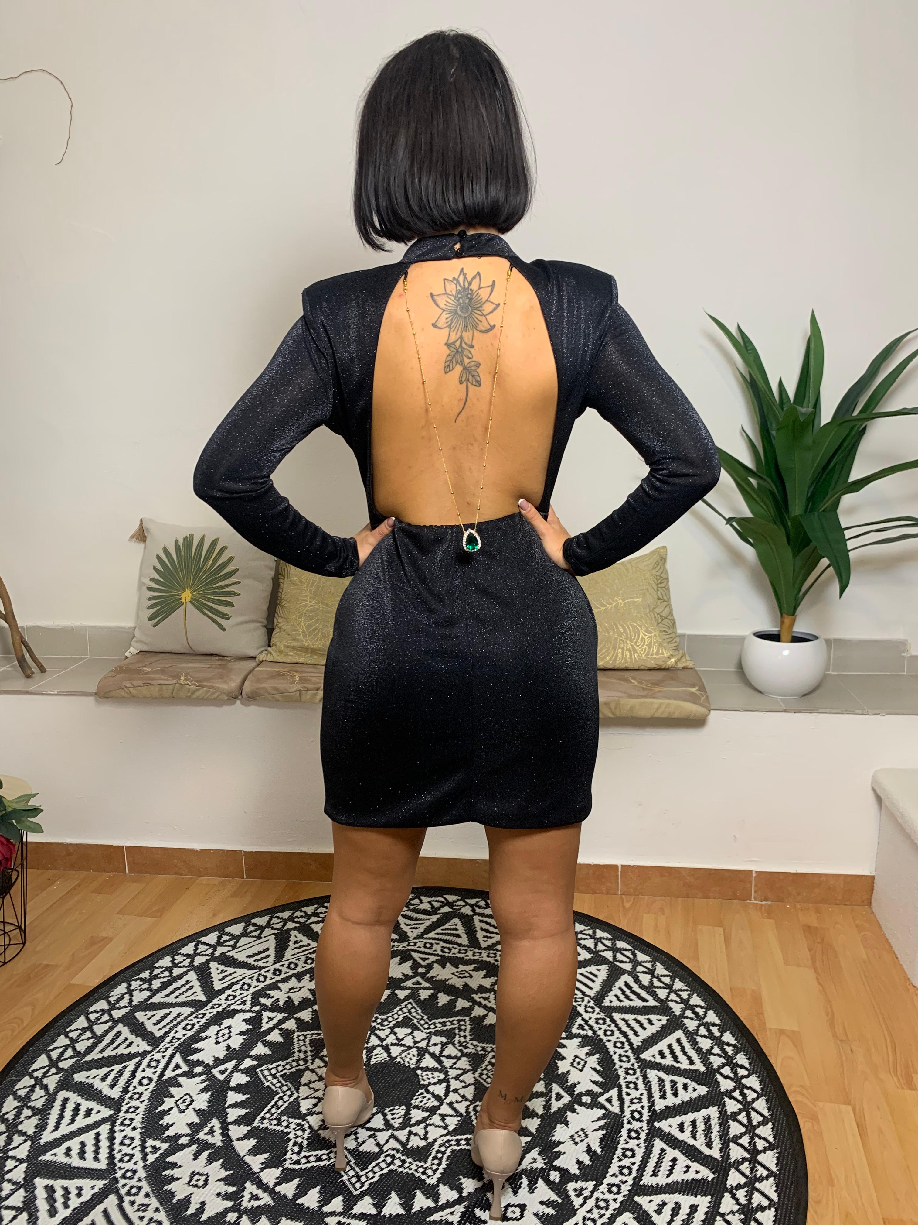 L’abito Collana di Dremèe è un mini dress dalla linea aderente con collo alto e spalline evidenti. La schiena completamente scoperta è impreziosita da una collana con una pietra effetto smeraldo, che dona un tocco di raffinata eleganza. Realizzato in tessuto tecnico composto da 68% poliamide e 32% fibra metallica, combina comfort e brillantezza. La modella indossa la versione nera in taglia 44, altezza 170 cm e peso 62 kg. Perfetto per occasioni in cui distinguersi con stile e sofisticatezza.