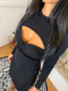 Twinset Milano presenta questo abito in morbida maglina, caratterizzato da un dettaglio distintivo: un ampio foro sul seno nella parte superiore, che mette in risalto la scollatura con coppe preformate integrate. La modella, alta 175 cm e con un peso di 54 kg, indossa una taglia S (40). Composizione: 38% viscosa, 38% poliammide, 22% poliestere.