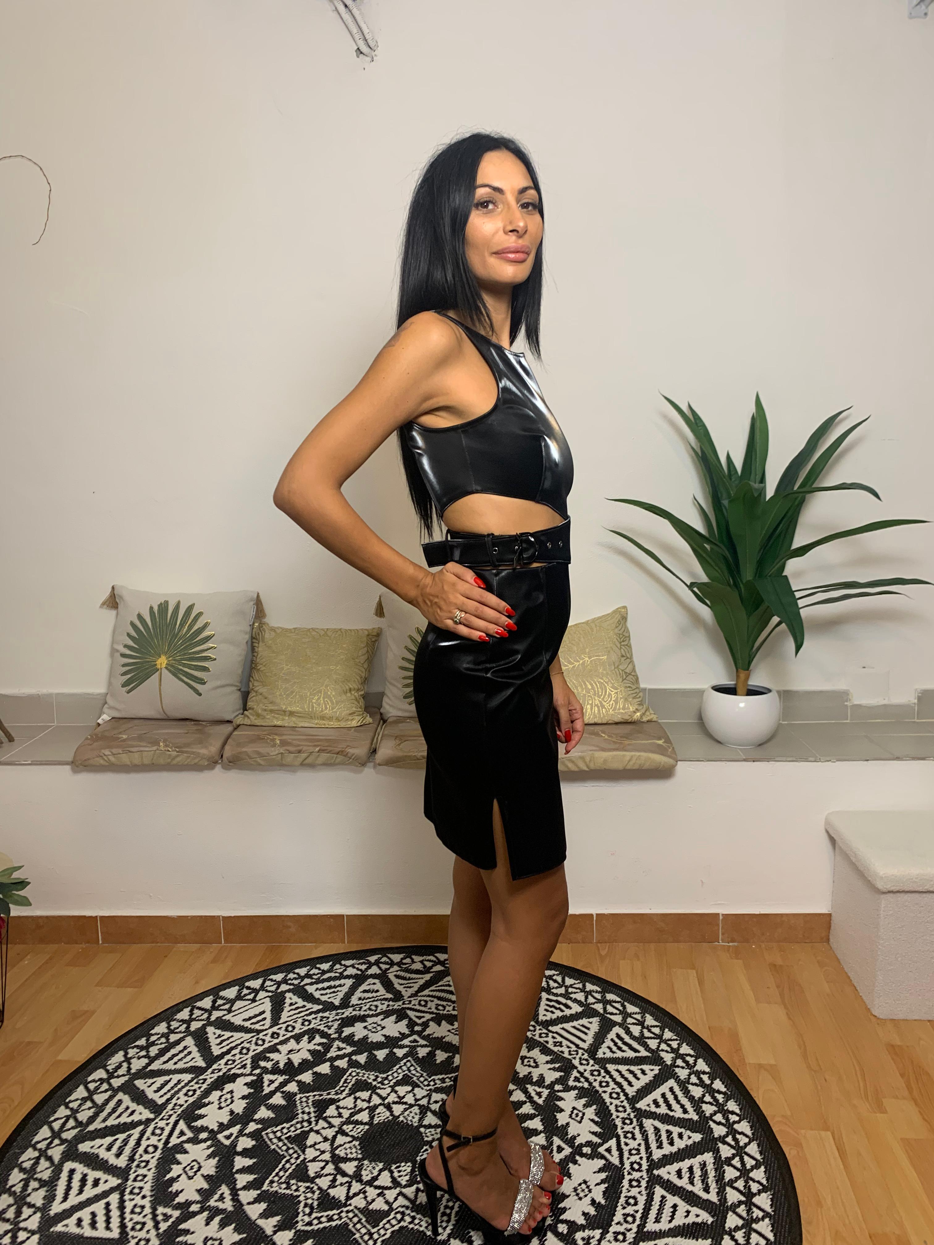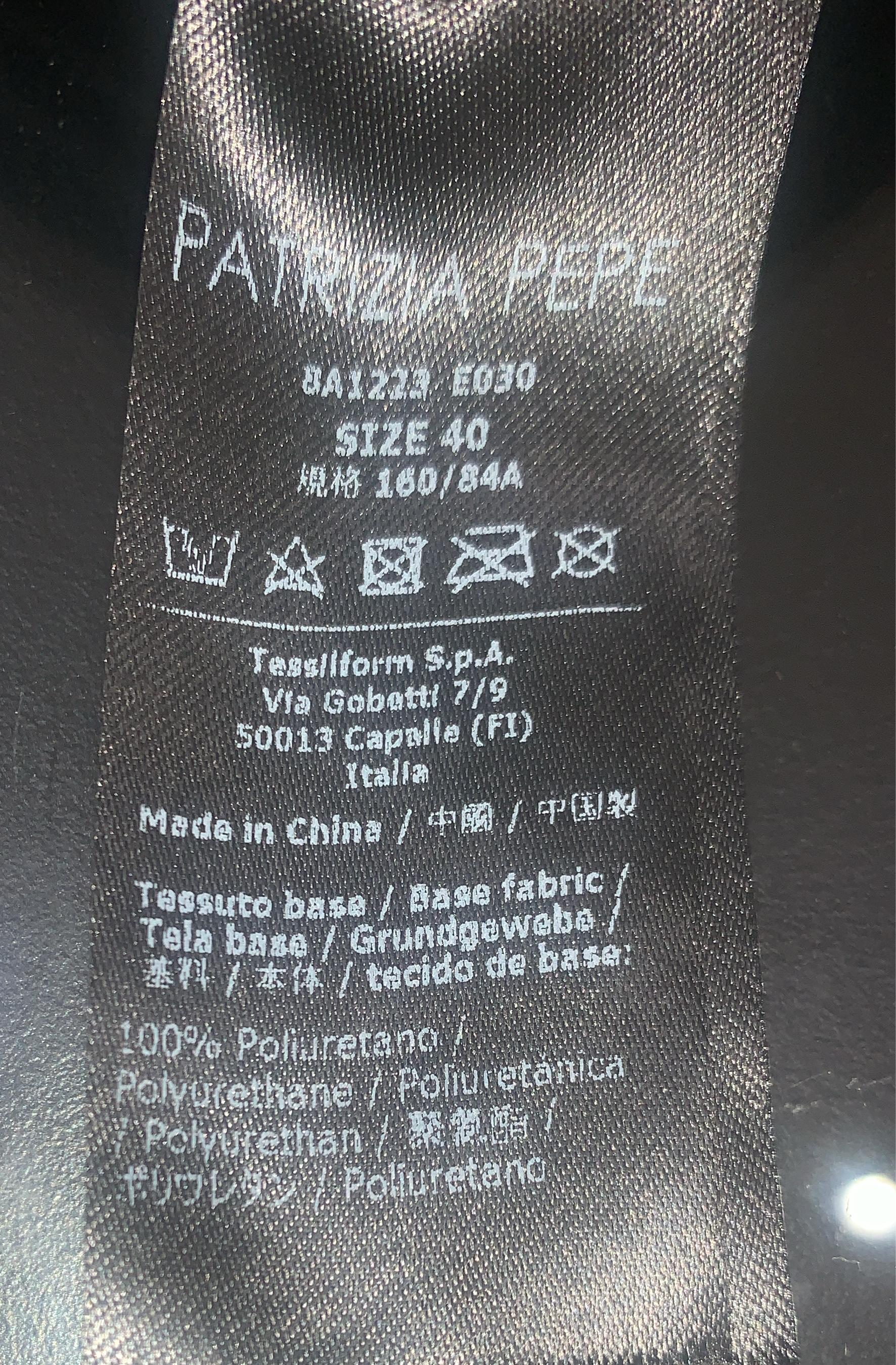 PATRIZIA PEPE presenta questo abito corto in similpelle, caratterizzato da una linea giromanica e un taglio alla vita arricchito da una cintura decorativa con fibbia logo. Il modello include uno spacco laterale per un tocco di eleganza. La modella, alta 175 cm e 54 kg, indossa una taglia 40 che calza perfettamente. Composizione: 100% poliuretano.