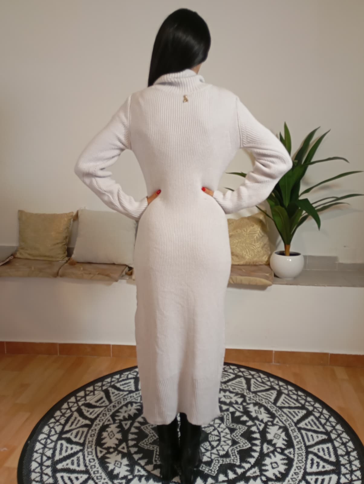 Abito Patrizia Pepe. Vestito lungo in tessuto retinato con collo alto, rifinito con costine su collo, maniche e orlo. Presenta un ciondolo caratteristico con il logo del marchio. Composizione: 52% viscosa, 26% poliestere, 22% poliammide. La modella indossa la taglia ed è alta 175 cm con un peso di 54 kg.