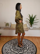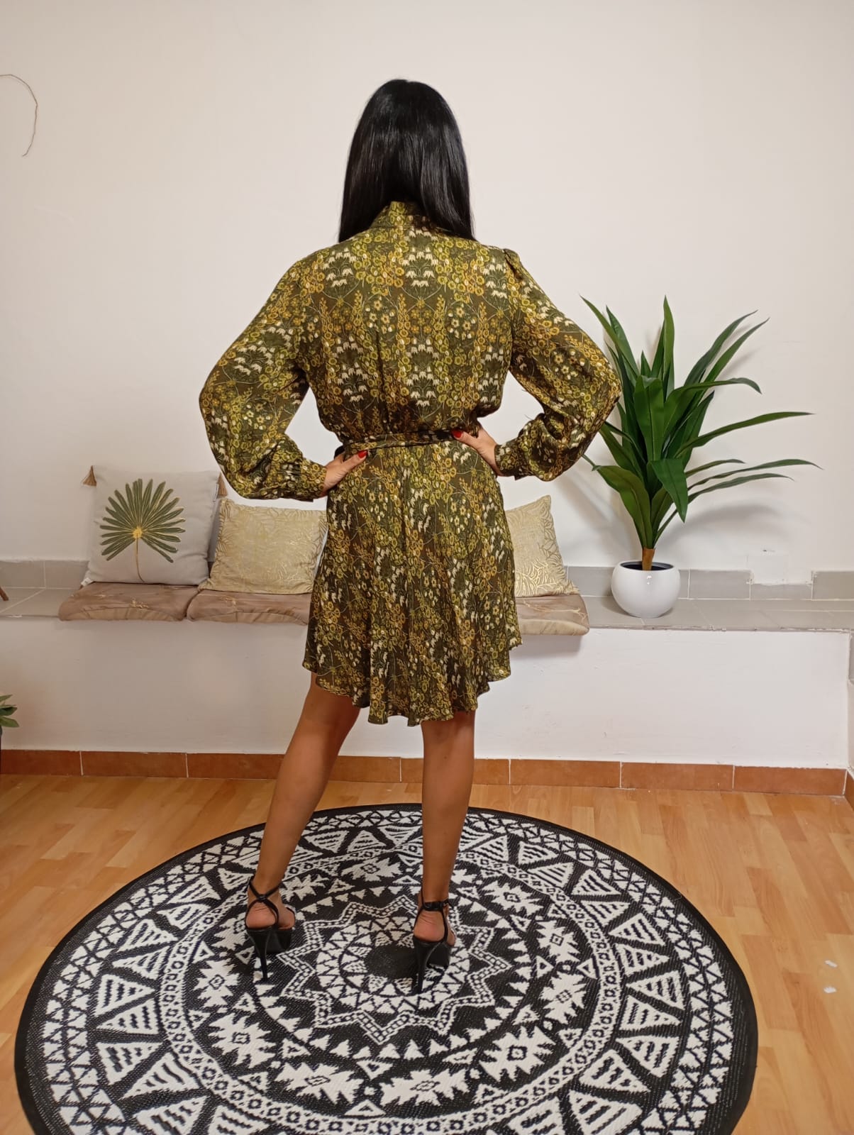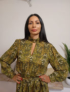 MAESTA presenta un elegante abito realizzato in pura viscosa, caratterizzato da una chiusura con bottoncini sul mezzo collo che si apre dolcemente creando un effetto asola morbido, arricchito da una cintura in vita. La modella, alta 175 cm e con un peso di 54 kg, indossa una taglia 42. Composizione: 100% viscosa.