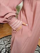 Questa creazione di Sfizio offre una linea straordinaria con dettagli minimalisti ma di grande effetto: un design senza collo con chiusura a lecchetto. Le maniche a sbuffo sono completate da polsini ricamati con bottoncini raffinati. La modella, alta 170 cm e con un peso di 62 kg, indossa una taglia 42. Il tessuto è composto dall’88% di viscosa e dal 12% di lana vergine.