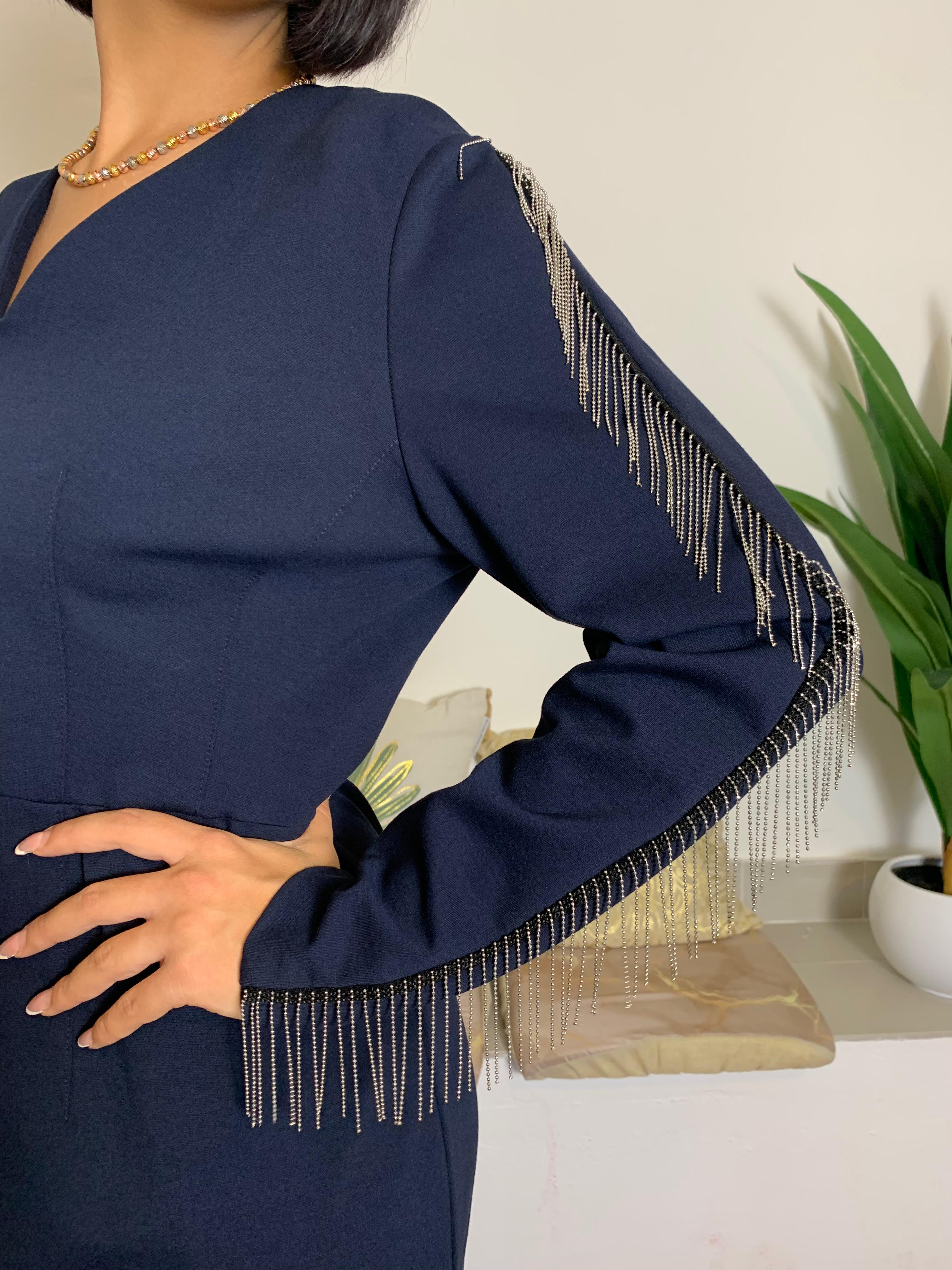 CLIPS MORE presenta un abito versatile con scollo a V e rifiniture in frange sottili di metallo sulle maniche, caratterizzato da una silhouette essenziale e pulita. Il modello, una taglia 50, è indossato da una modella alta 170 cm, con un peso di 62 kg. Materiale: 65% viscosa, 32% poliammide, 3% elastan.