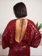 Aniye B presenta un elegante abito dalla vestibilità aderente nella parte della gonna, ma con un tessuto soffice. Si distingue per una profonda scollatura posteriore, chiusa da un sottile laccetto. La sua vera particolarità risiede nella copertura di paillettes cucite con estrema precisione, che valorizzano la sua bellezza. La modella, alta 170 cm e del peso di 62 kg, indossa una taglia 42.