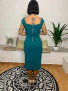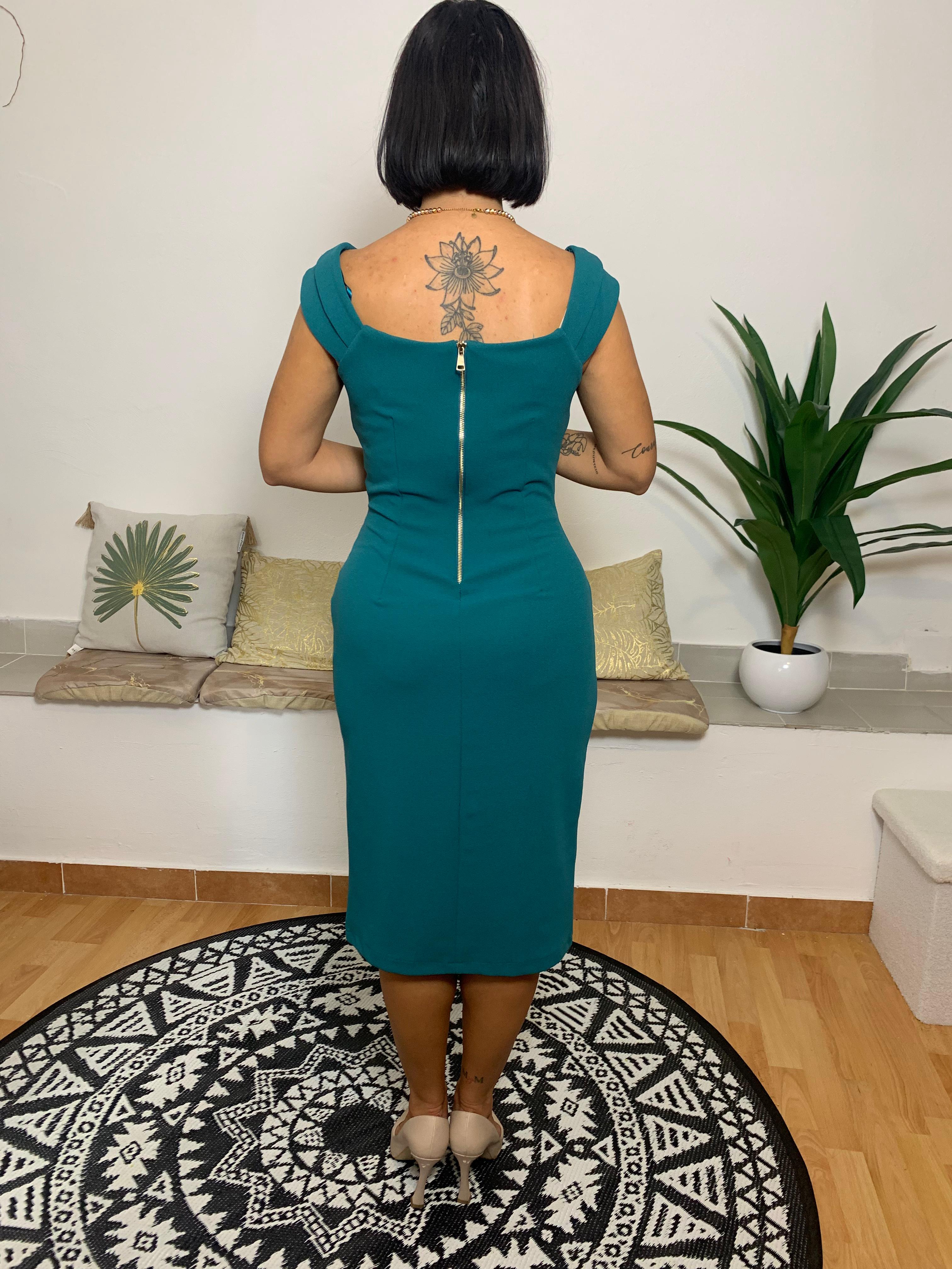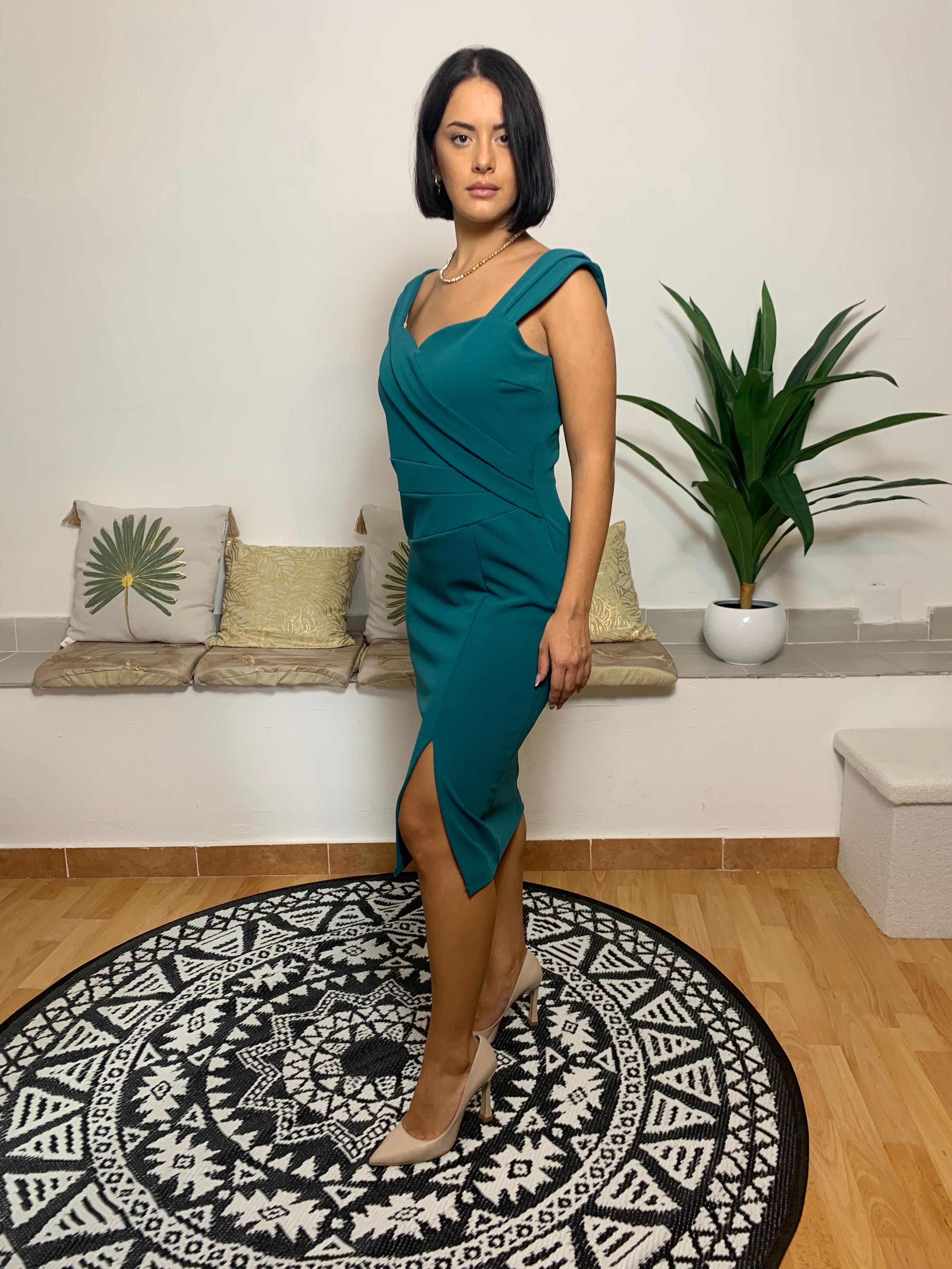 RINASCIMENTO. Questo abito sofisticato presenta spalline ampie e una scollatura a cuore con eleganti drappeggi e cuciture precise sul punto vita. È dotato di una zip sul retro e di uno spacco laterale che esalta la linea della gamba. La modella indossa una taglia XL, 170 cm di altezza e 62 kg di peso. Composto da 96% poliestere e 4% elastan, assicura comfort e una vestibilità ottimale.