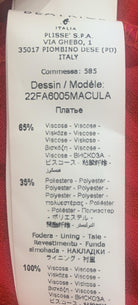 Beatrice B propone un abito lungo dal grande impatto, caratterizzato da un nodo al collo e uno scollo che simula un effetto incrociato. Anche in vita è presente un dettaglio che richiama l’incrocio con un laccetto, ma tutto il capo è cucito su misura. La parte inferiore dell’abito si conclude con una delicata balza. La modella, alta 170 cm e con un peso di 62 kg, indossa una taglia 42. Il tessuto è composto per il 65% da viscosa e per il 35% da poliestere, mentre la fodera interna è in 100% viscosa.