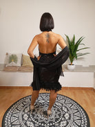 Maria Vittoria Vinci propone un abito con paillettes e corallini cuciti su tutta la superficie. Presenta una chiusura incrociata sul davanti, dettagliate aperture nella parte superiore e spalle scoperte. Il fondo è rifinito con piume tono su tono e include una stola abbinata. La modella, alta 170 cm e peso 62 kg, indossa una taglia 46 ma ha una vestibilità piccola. Composizione: 100% poliestere.