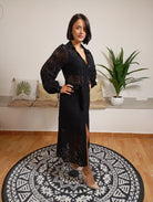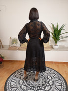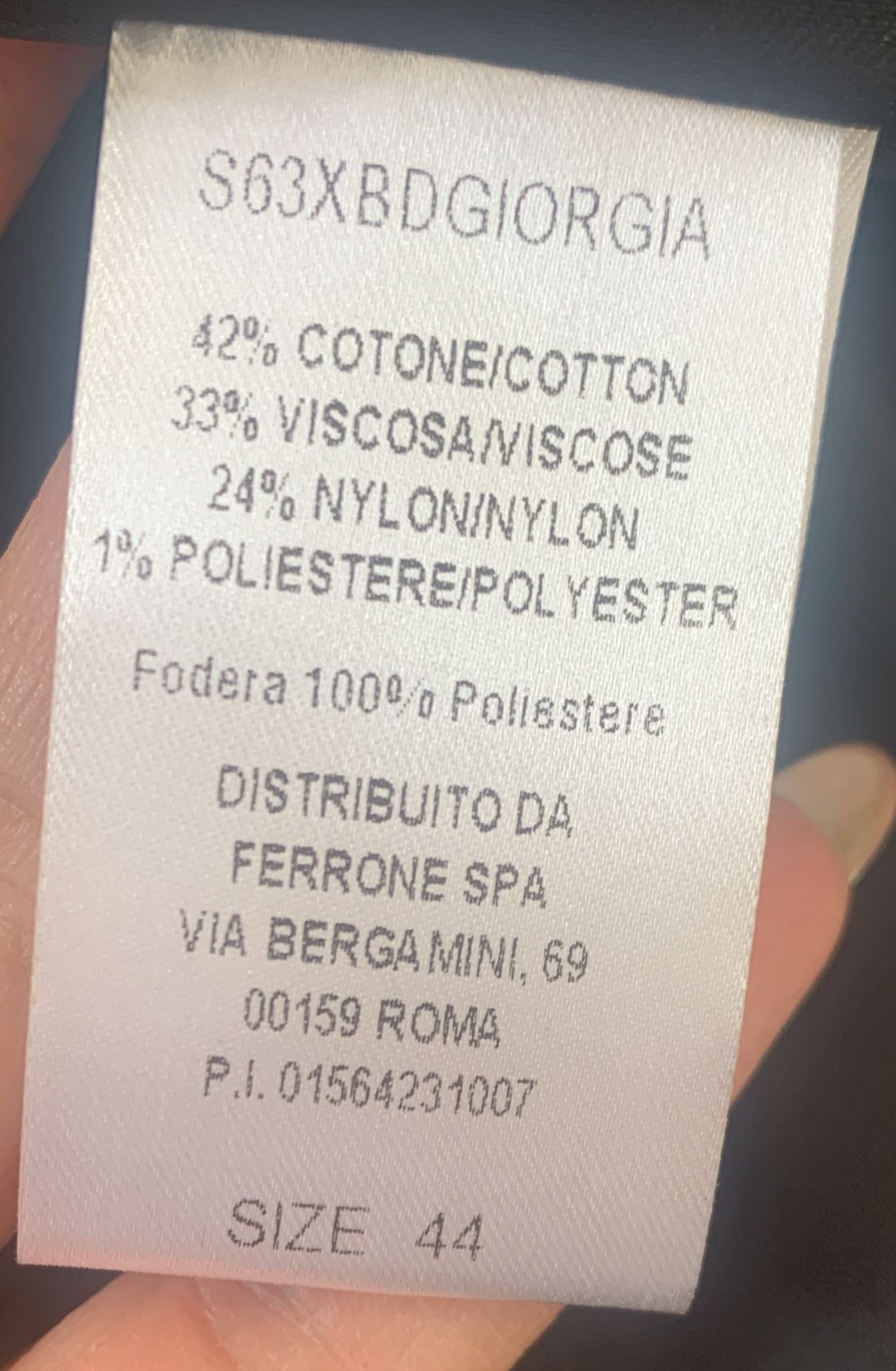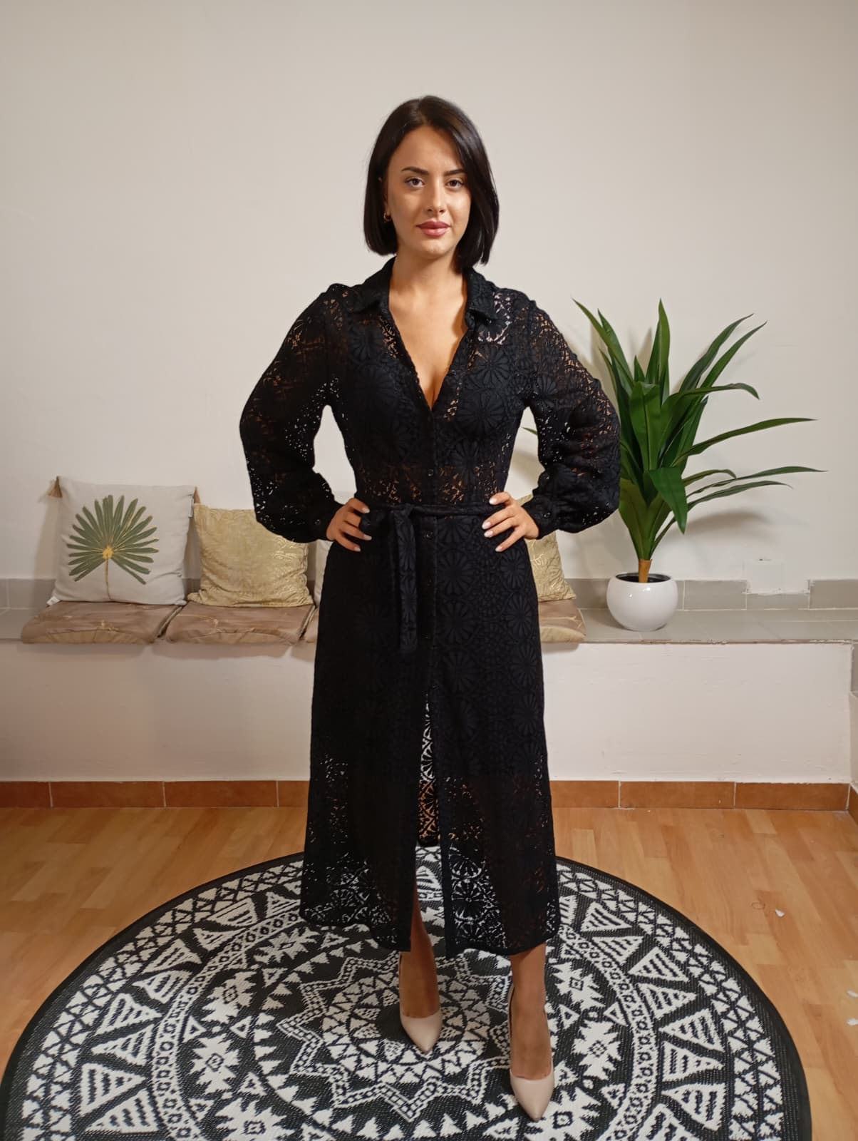 Sandro Ferrone presenta un abito interamente realizzato in merletto, con modello a camicia dotato di chiusura a bottoncini e sottoveste integrata nella parte della gonna. La vestibilità è unica e impeccabile; la modella, alta 170 cm e con un peso di 62 kg, indossa una taglia 44. Composizione: 42% cotone, 33% viscosa, 24% nylon, 1% poliestere.