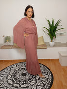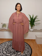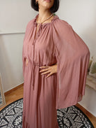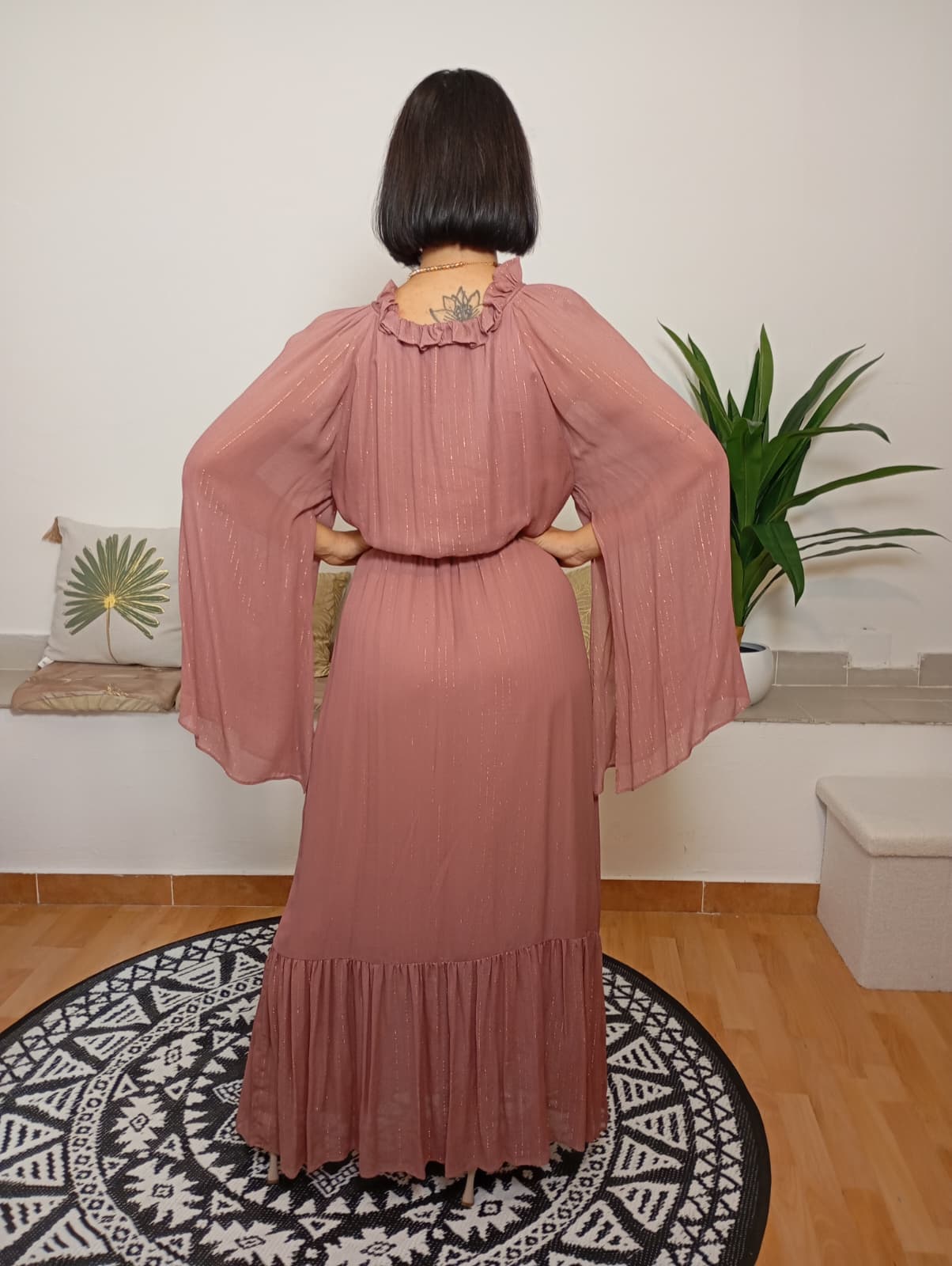 Il marchio Sfizio si distingue per uno stile raffinato e ricco di dettagli curati. Questo abito, realizzato in una delicata tonalità con filamenti in lurex, presenta un riccio intorno al collo chiuso da un laccetto e una leggera scollatura. Le maniche, con spacchi interni, creano un effetto ali, mentre l’elastico in vita valorizza la silhouette. La gonna morbida termina con una balza che aggiunge movimento. La modella indossa una taglia 40, è alta 170 cm e pesa 62 kg. Composizione: 99% viscosa, 1% poliestere.