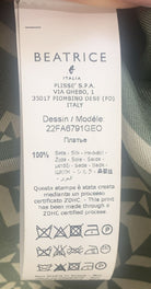 L'abito Beatrice B. presenta una silhouette morbida e regolare, caratterizzata da una fantasia e una combinazione di colori studiate nei toni salvia e champagne. Il modello ha un collo a camicia con scollo a V, tasche invisibili e lacci ai polsini. La modella, alta 170 cm e con un peso di 62 kg, indossa una taglia 42. Realizzato al 100% in seta, garantisce comfort e qualità superiore.