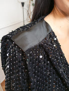 Relish presenta un abito in ciniglia impreziosito da paillettes, con una profonda scollatura anteriore e posteriore sulle spalle. L'abito è completato da fasce in raso sui lati e una gonna aderente con drappeggi sia sul davanti che sul retro. Il modello è indossato da una modella alta 175 cm, peso 54 kg, che porta una taglia 42. Composizione: 100% poliestere.