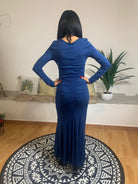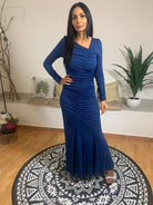 L'abito Beatrice B. presenta una linea avvolgente con finiture a sirena e uno scollo asimmetrico drappeggiato sia sul davanti che sul retro. Questo capo esalta elegantemente la silhouette femminile, valorizzandone la sensualità. La modella, alta 175 cm e con un peso di 54 kg, indossa una taglia 42. Realizzato al 100% in viscosa, garantisce comfort e morbidezza.