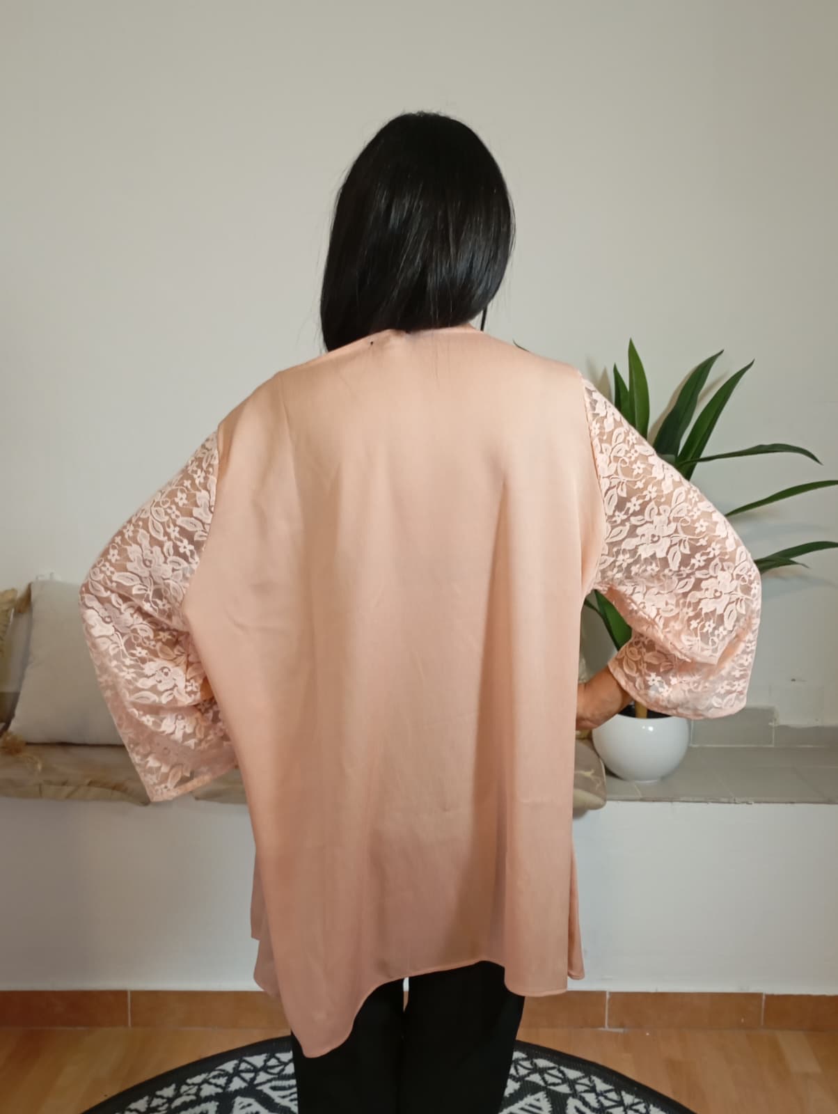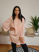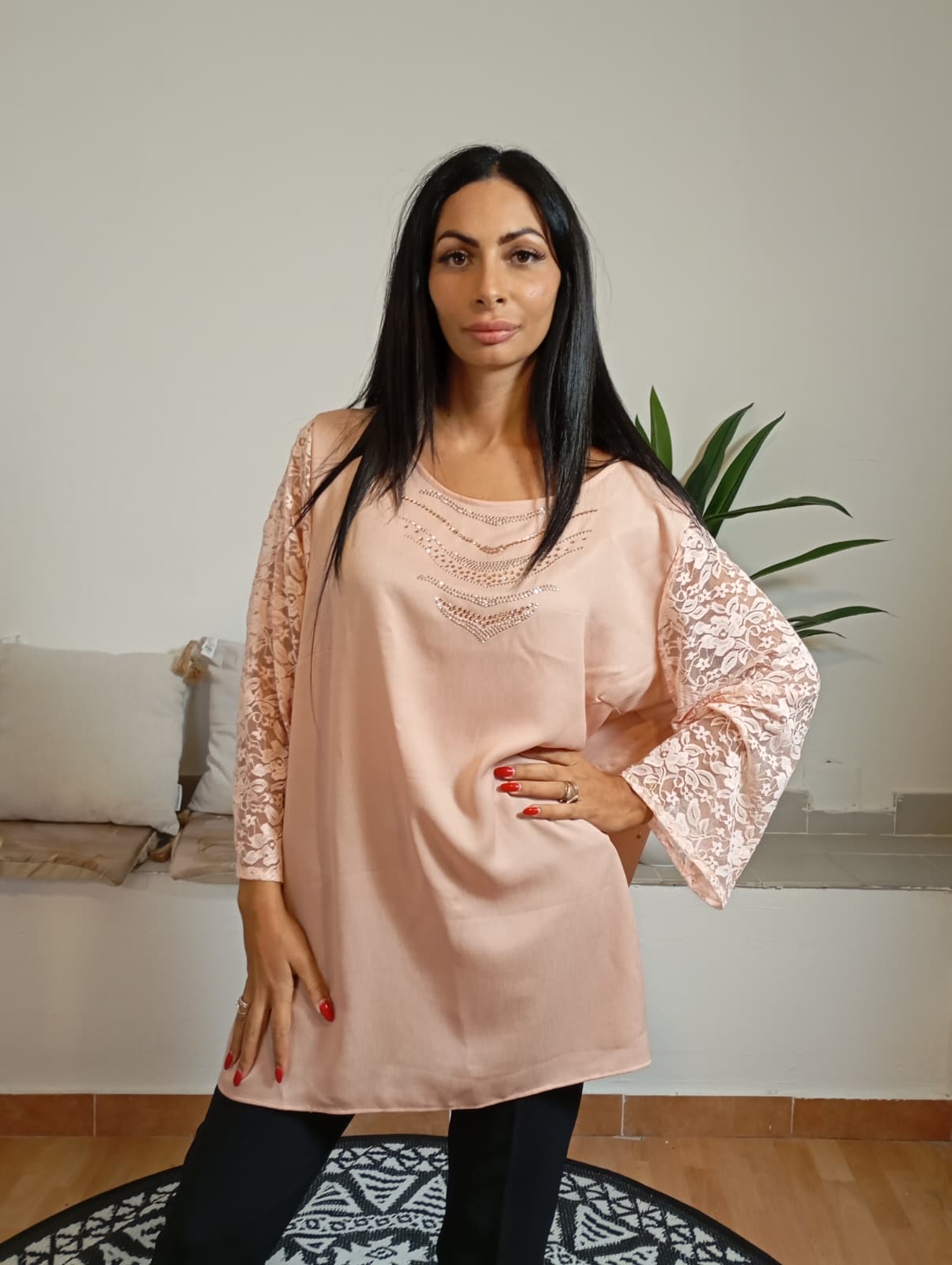 La blusa da donna firmata DONNA GI. si caratterizza per le maniche in pizzo e il taglio over con girocollo arricchito da dettagli in strass. La modella, alta 175 cm e dal peso di 54 kg, indossa una taglia M. Realizzata al 100% in poliestere.