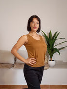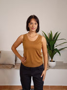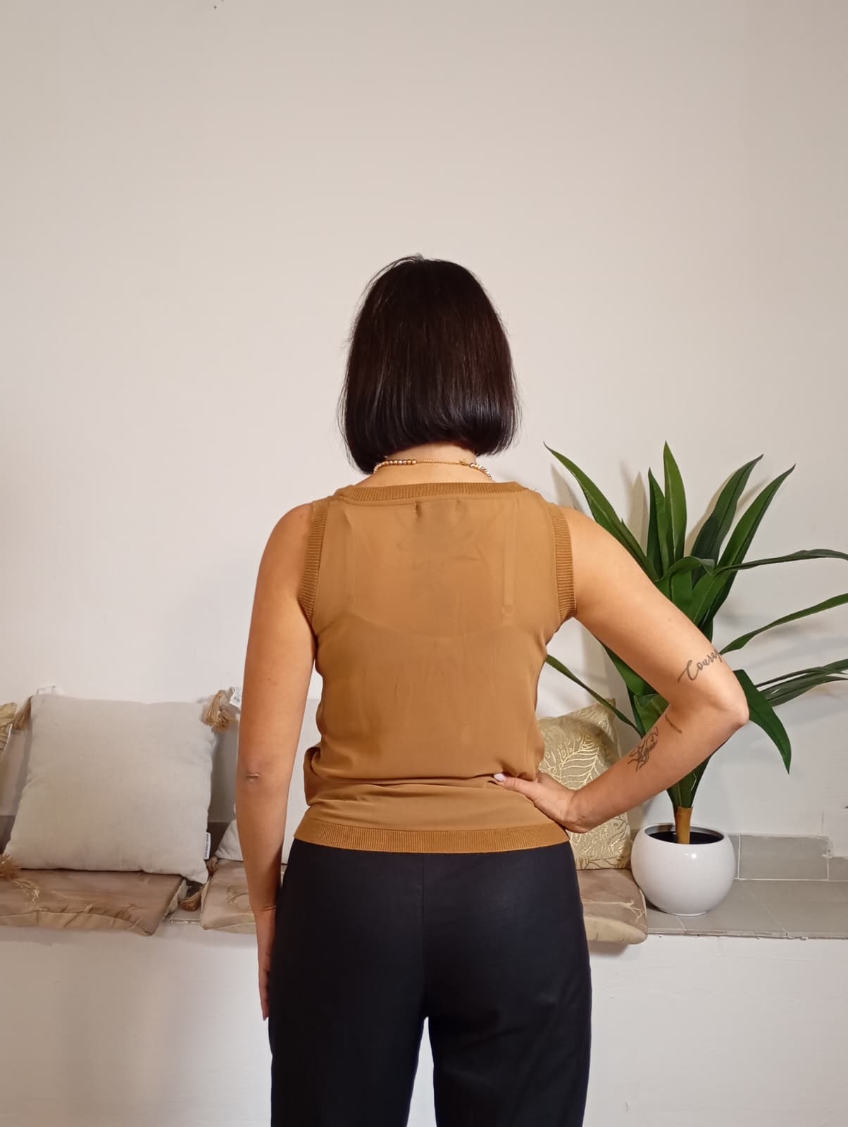 CANOTTA CRISTINA EFFE. Canotta realizzata al 100% in poliestere, con dettagli a costine sul girocollo, sul bordo inferiore e intorno alle maniche. Il davanti è in materiale opaco, mentre il retro è trasparente. La modella misura 170 cm ed è alta 62 kg.