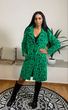 Peggy Ho presenta questo straordinario cappotto in maglia, caratterizzato da una morbidezza eccezionale e dalla stampa animalier ispirata allo zebrato. Caldo e soffice, il modello ha un taglio classico con tre bottoni e tasche laterali funzionali. La modella, alta 175 cm e 54 kg, indossa la taglia S nelle varianti verde e fucsia. Realizzato in 70% poliammide e 30% poliestere, questo cappotto unisce eleganza e comfort con materiali di alta qualità.