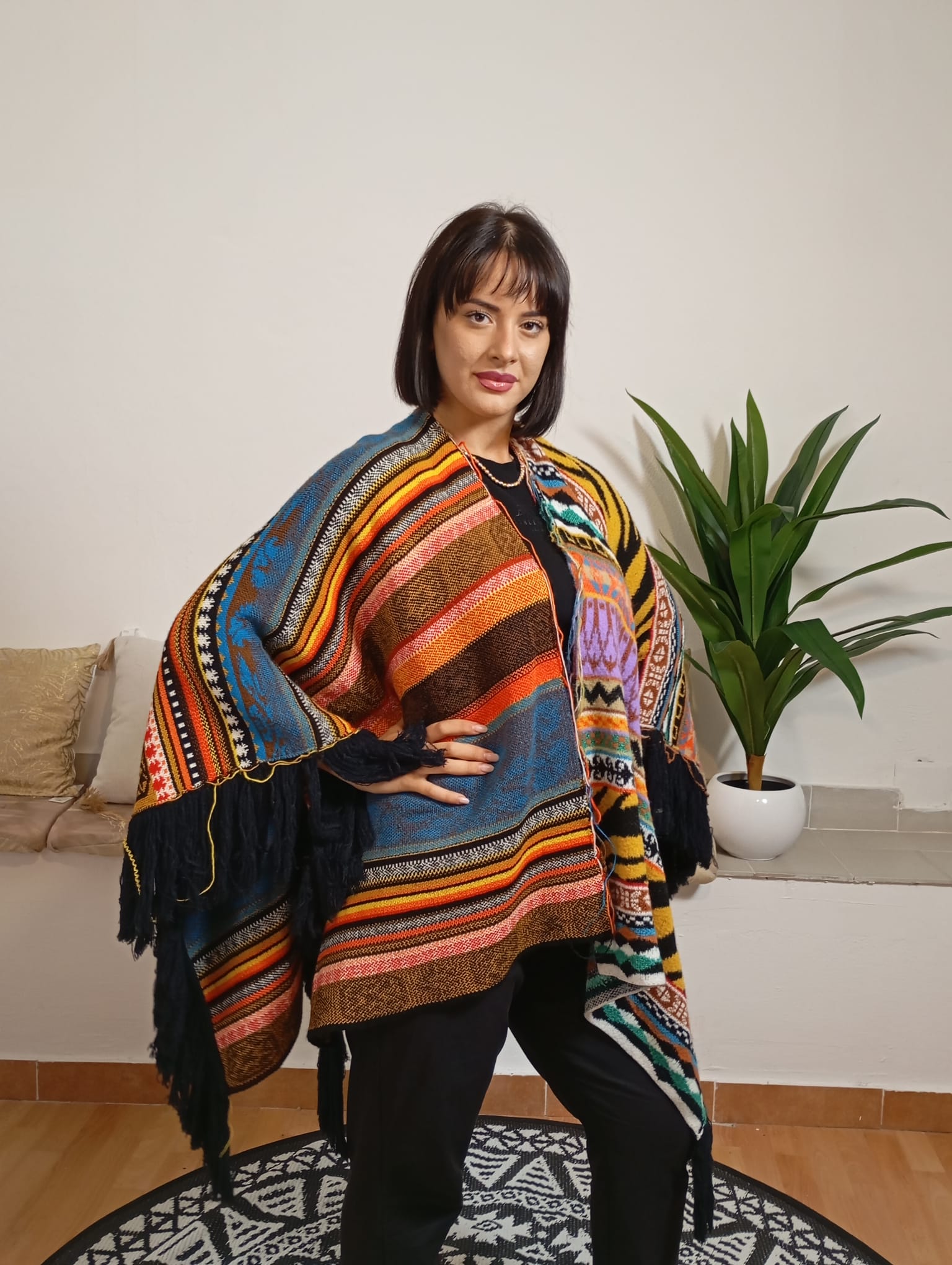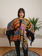 PONCHO AKEP. Vivace e arricchito da frange che riprendono le tonalità del capo, offre un mix caldo e soffice composto da 36% lana merino, 32% acrilico, 16% poliammide e 16% alpaca. Indossato da una modella alta 170 cm e con un peso di 62 kg, garantisce una vestibilità confortevole e raffinata.