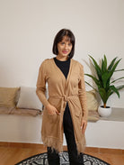 Il cardigan FRANCESCO COPPOLA, caratterizzato da un design semplice e morbido, è privo di cappuccio ma completo di cintura e tasche. Realizzato con una combinazione di 54% viscosa e 46% poliammide, presenta una raffinata decorazione dorata sulla parte inferiore, arricchita da piume che si adagiano su un tessuto a costine. La modella che lo indossa è alta 170 cm e pesa 54 kg.