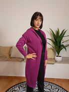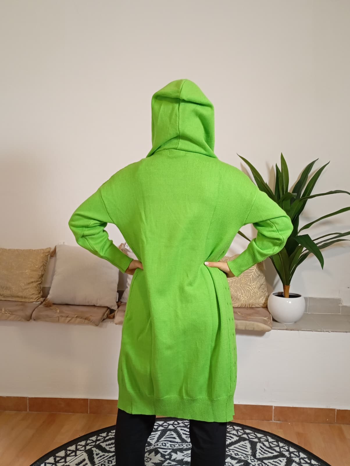 CARDIGAN FRANCESCO COPPOLA. CARDIGAN INVERNALE PESANTE DOTATO DI CAPPUCCIO, PRIVO DI CHIUSURE E TASCHE, CON DECORI PARTICOLARI DISTRIBUITI SU TUTTO IL CAPO. IL MODELLO INDOSSANTE HA UN PESO DI 62 KG E UN’ALTEZZA DI 170 CM.