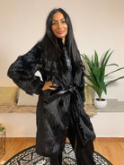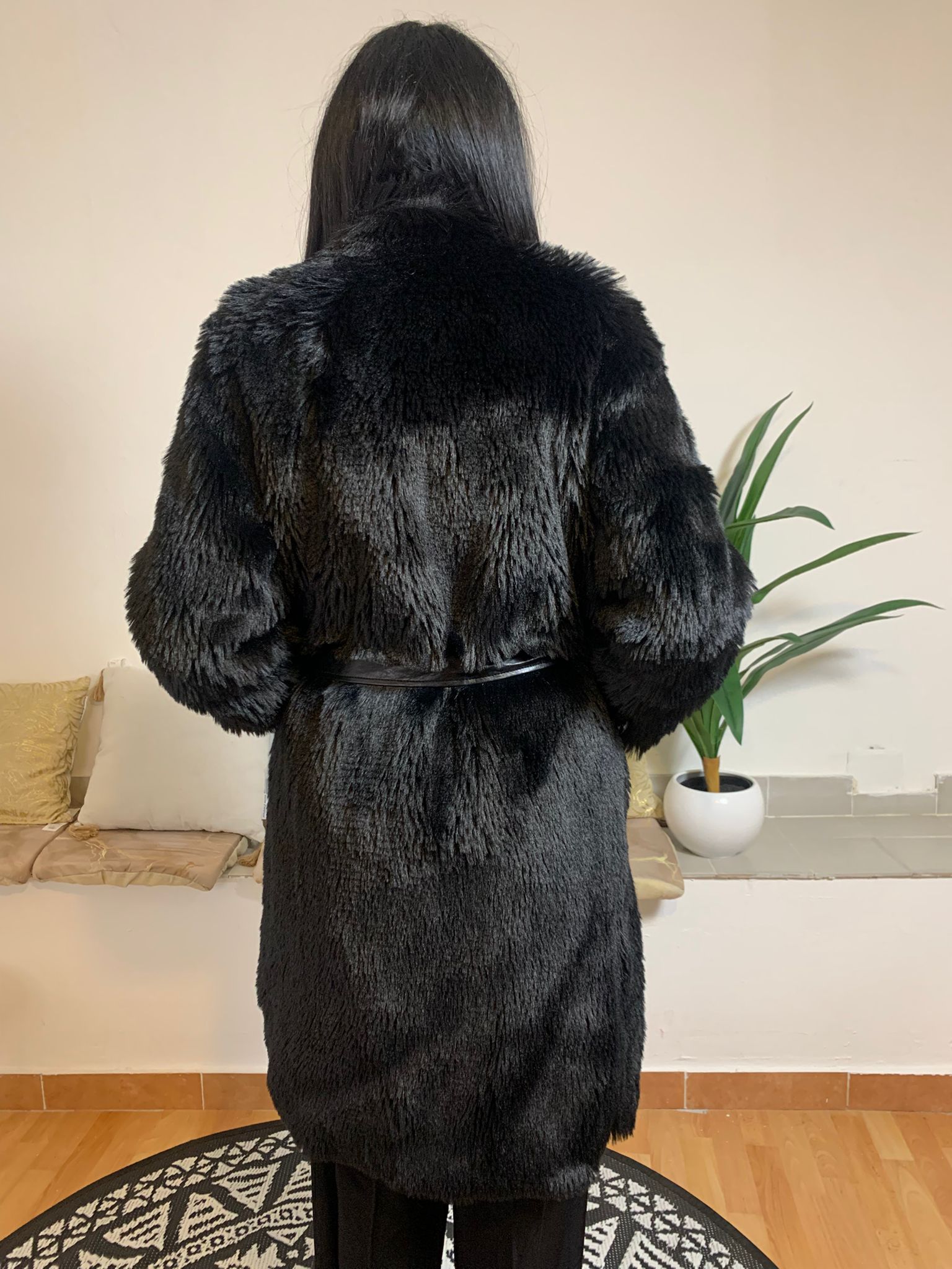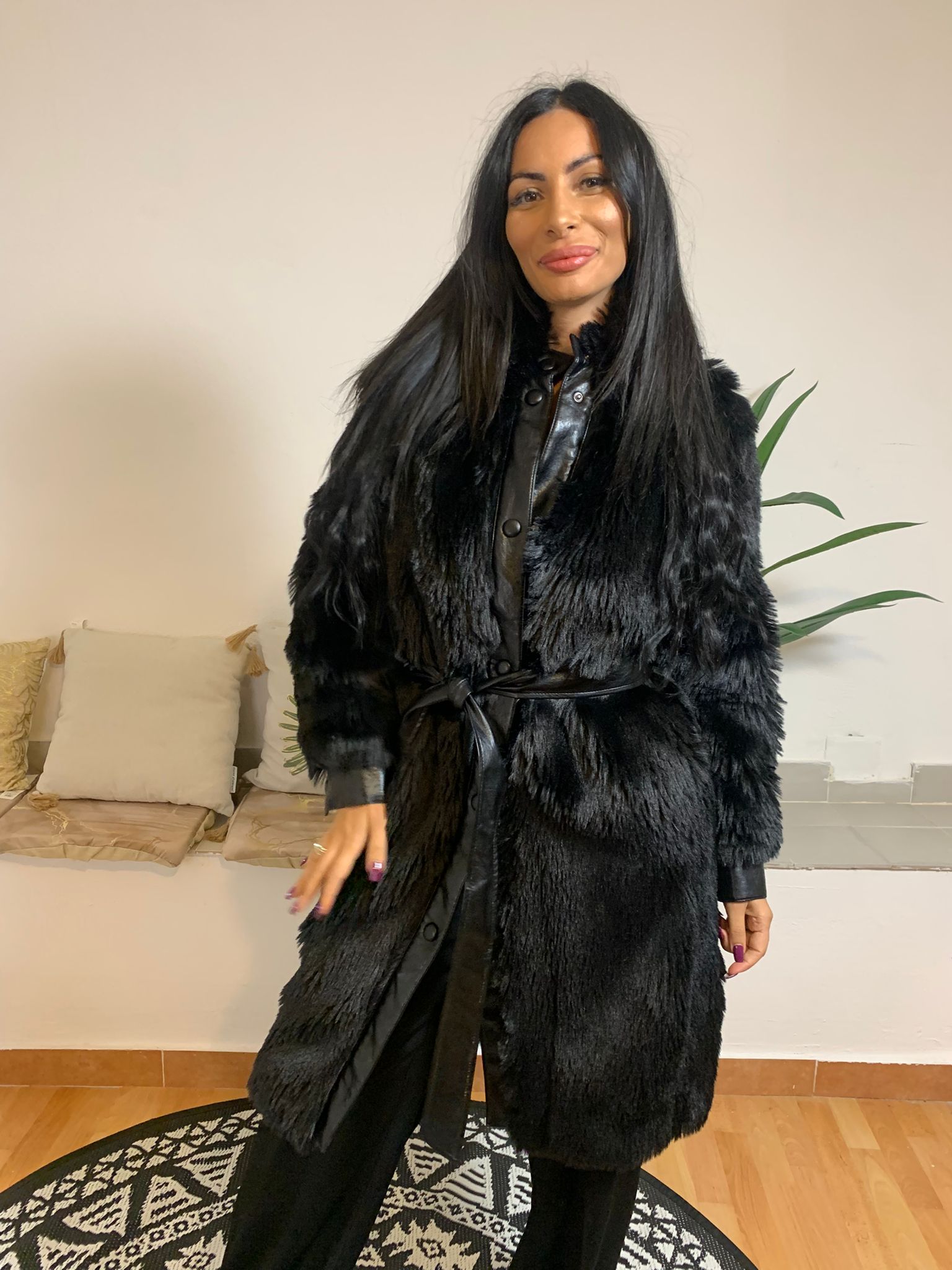 Questo twinset in ecopelliccia rappresenta la scelta ideale per affrontare la stagione fredda con stile e consapevolezza. La composizione mista combina il calore avvolgente del materiale sintetico con dettagli in similpelle autentica alle estremità: polsini rifiniti, orlo inferiore e cintura coordinata che garantisce una silhouette definita. La texture morbida e isolante assicura comfort prolungato durante le giornate invernali. La modella indossa la taglia 40, è alta 175 cm e pesa 54 kg.