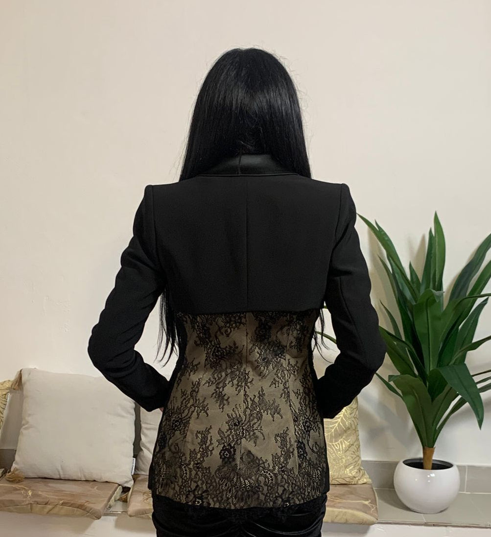 La giacca CLIPS si caratterizza per dettagli distintivi come il collo smoking, un raffinato bottone nero lucido e taschini con patta. La schiena, completamente realizzata in pizzo, conferisce al capo un aspetto elegante e innovativo. Indossata da una modella alta 175 cm e taglia 40, è realizzata con un mix di fibre composto dal 63% poliestere, 32% viscosa e 5% elastan. Una scelta eccellente per chi desidera un capo dall’eleganza unica e originale.