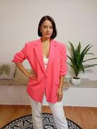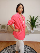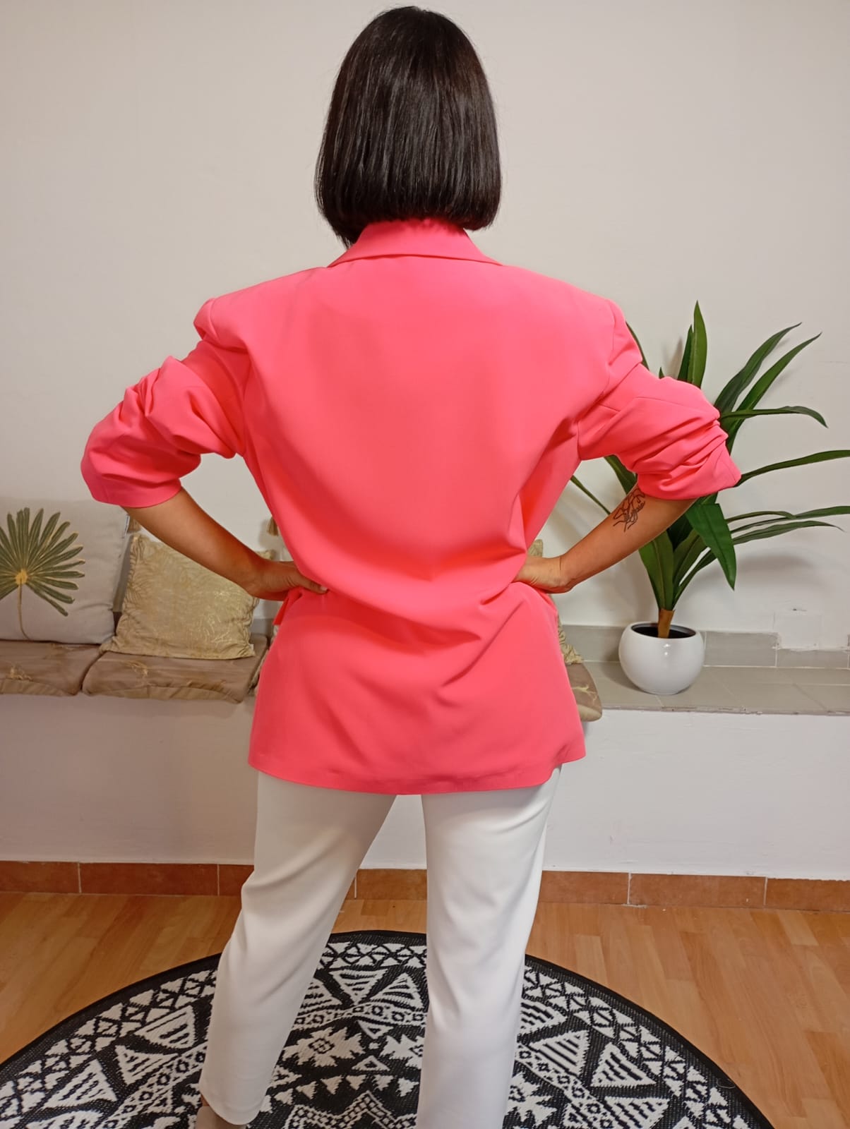La giacca Kostumn rappresenta un marchio dal design essenziale, caratterizzata da un colore particolare e una linea leggermente oversize. Il modello presenta due tasche a patta frontali, una tasca rifinita a frise sul petto e una chiusura con un solo bottone. La modella, alta 1,70 m e con un peso di 62 kg, indossa una taglia L.