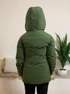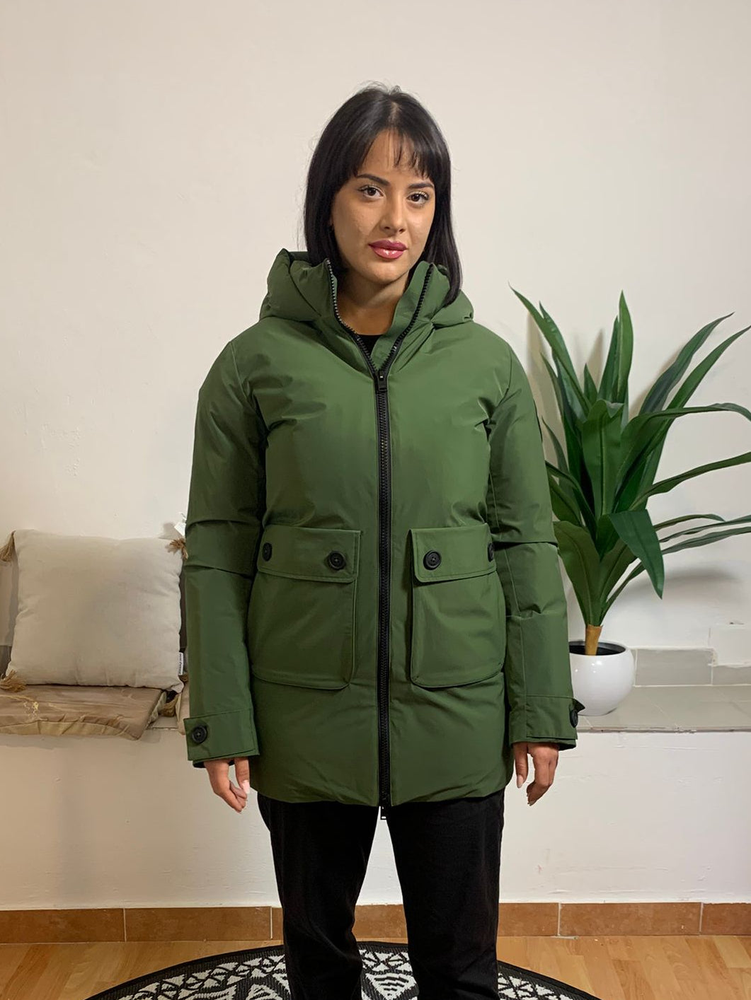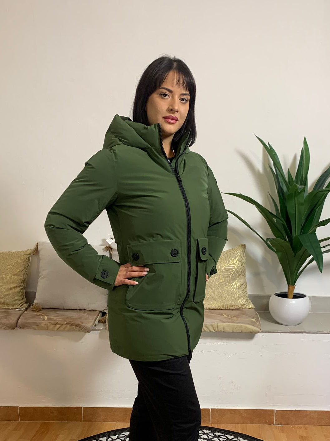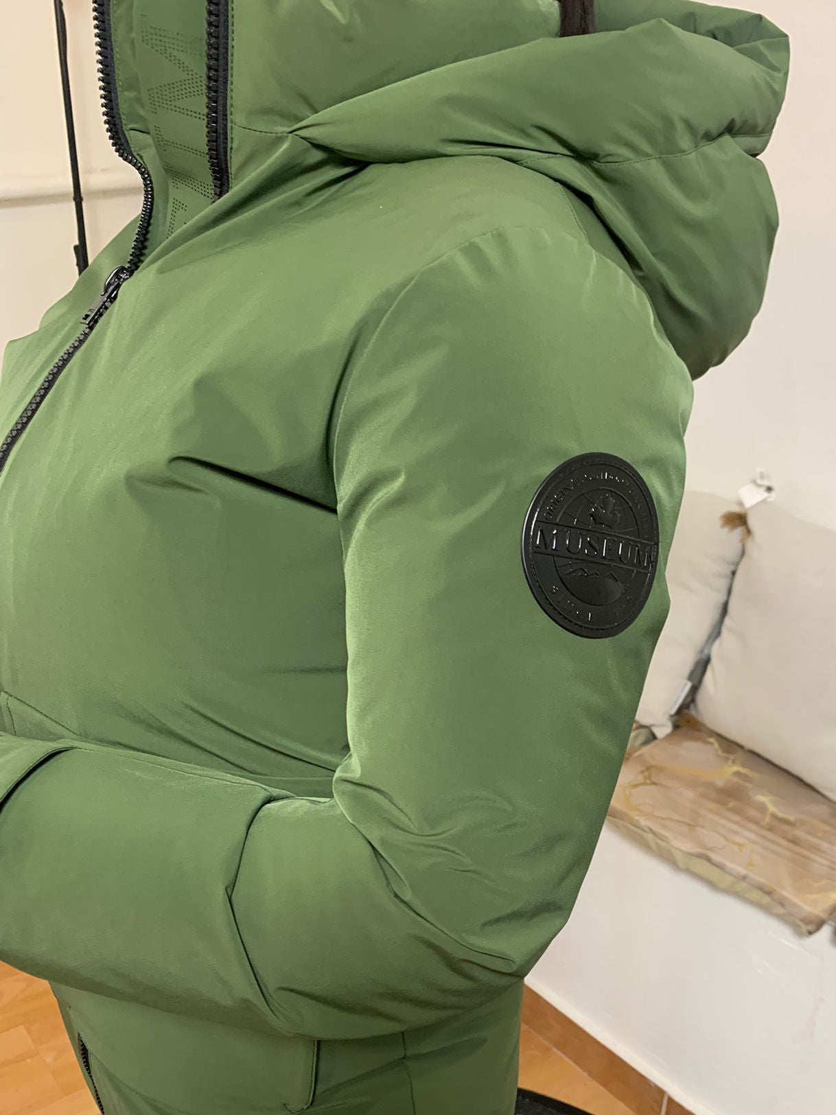 MUSEUM. Questo raffinato giubbino, realizzato in tessuto tecnico, presenta un cappuccio e due ampie tasche frontali con bottoni personalizzati. Le maniche sono rifinite con una fascia decorativa dotata di logo bottone. Imbottito con materiale riciclato, il capo è leggero, caldo, confortevole e traspirante. La composizione esterna è 100% Sorona, con fodera in 100% poliammide e imbottitura in 100% poliestere. Apprezzato per l'attenzione all'ambiente, il giubbino è indossato dalla modella alta 170 cm e 62 kg, che porta una taglia 42.