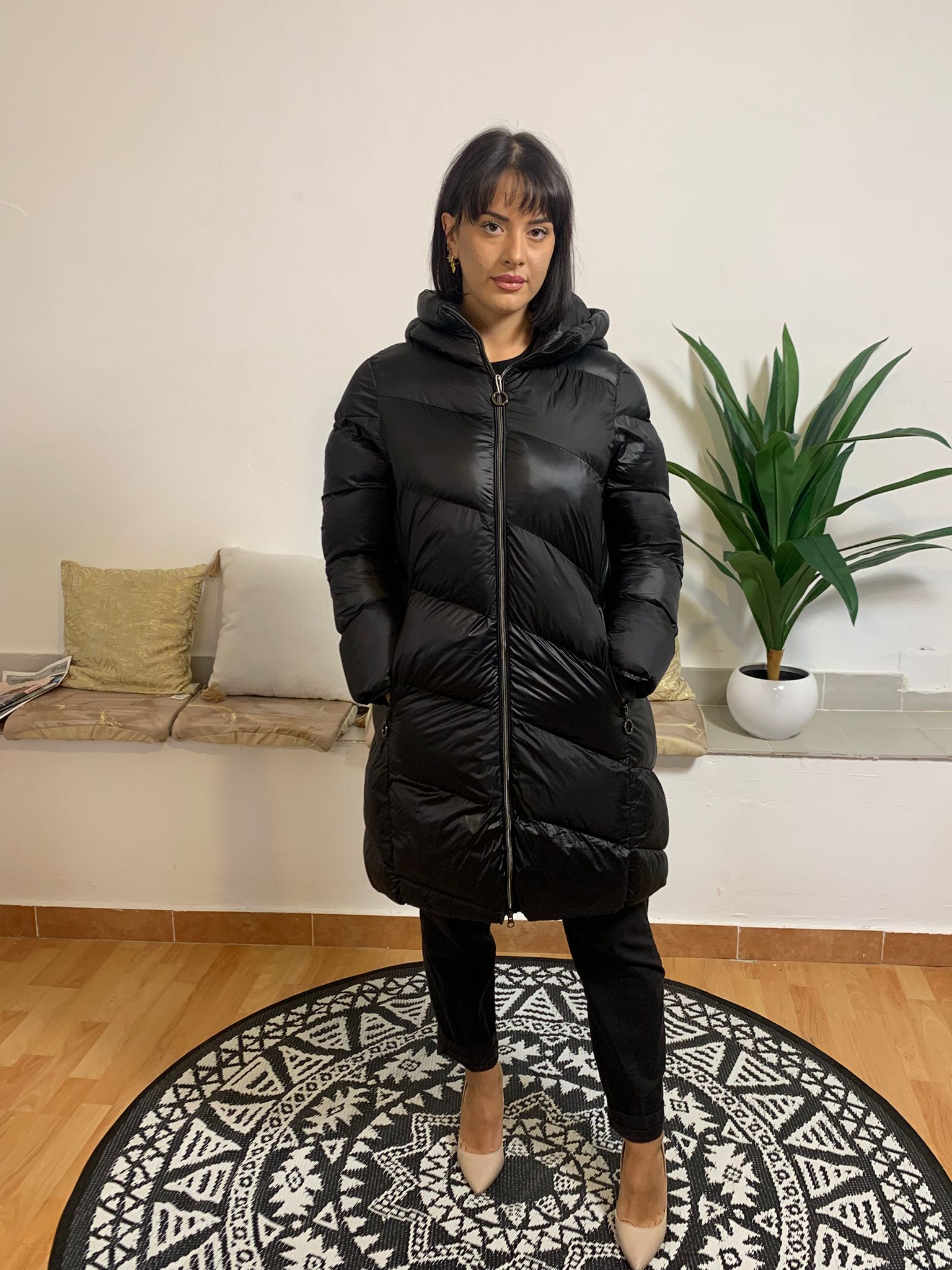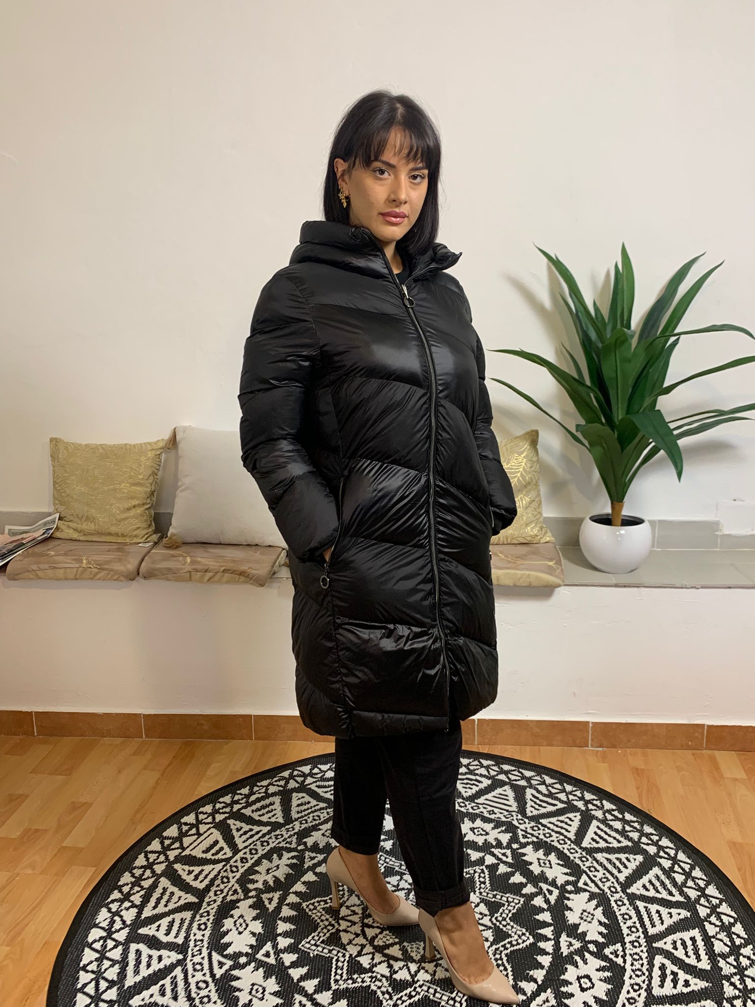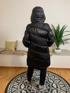 GIUBBINO TOY G è un giubbotto lungo dotato di cappuccio e di tasche con chiusura a zip, analogamente alla zip centrale. Realizzato al 100% in poliestere, è imbottito con ovatta per garantire comfort e calore. La modella ritratta pesa 62 kg ed è alta 170 cm.