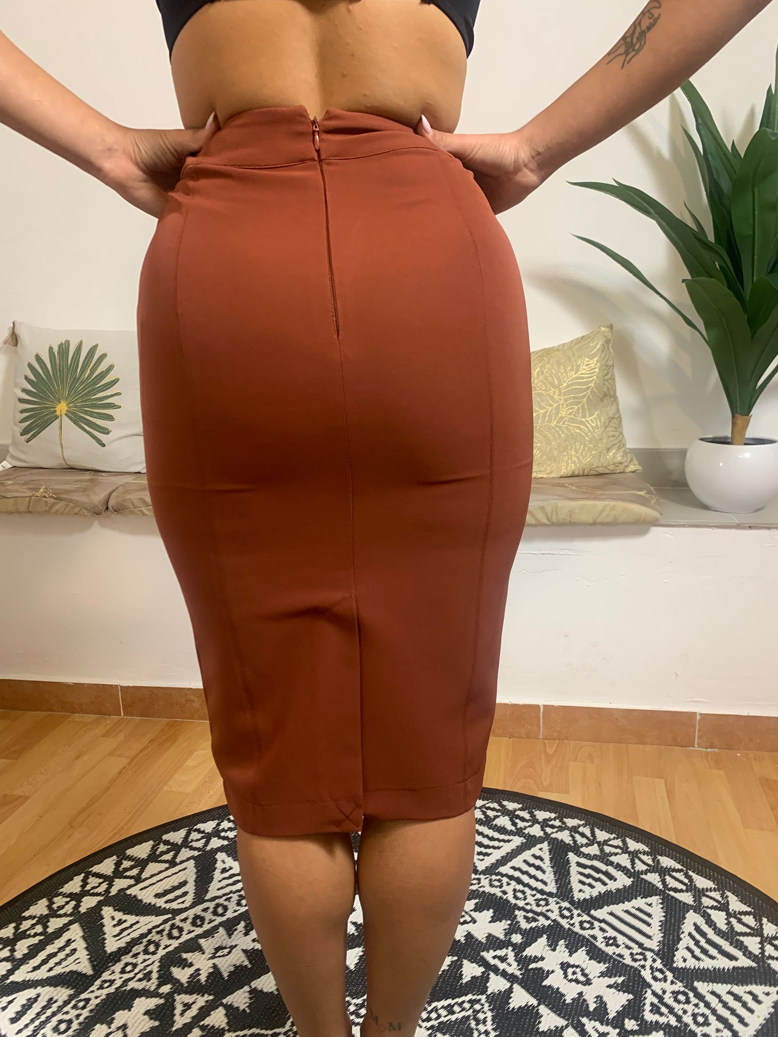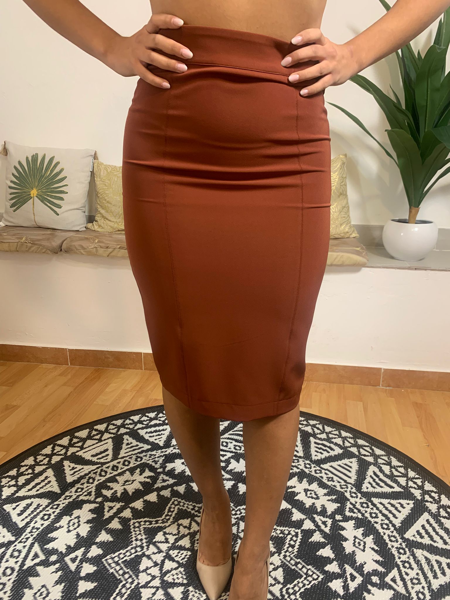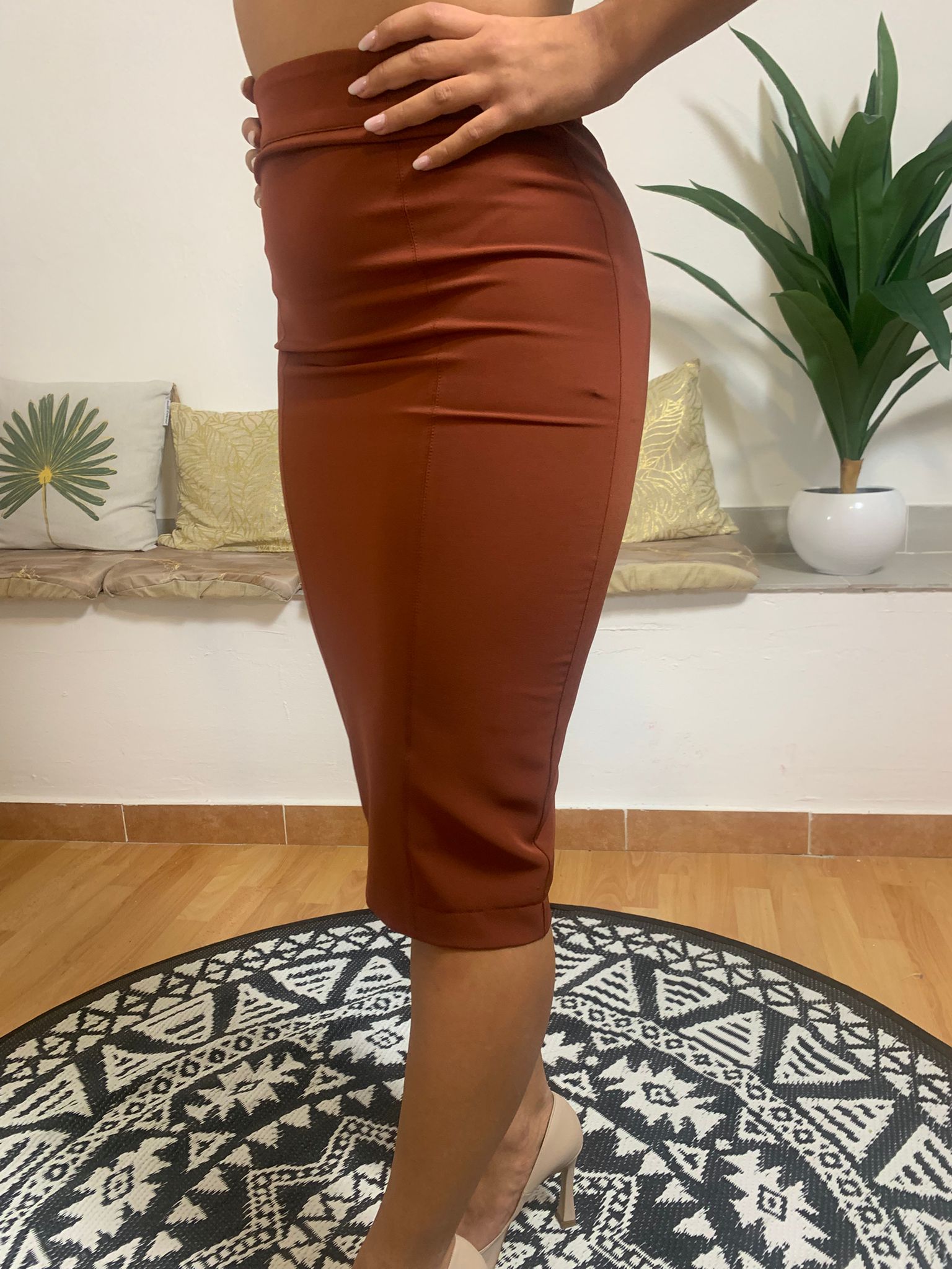 Nenette introduce una gonna longuette della linea Essenziale caratterizzata da un elegante tono marrone bruciato. La modella, con un’altezza di 170 cm e un peso di 62 kg, veste una taglia 40. Il capo è confezionato con una miscela di 94% poliestere e 6% elastan, che assicura una vestibilità confortevole e aderente.