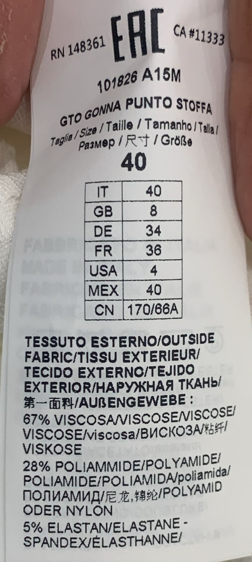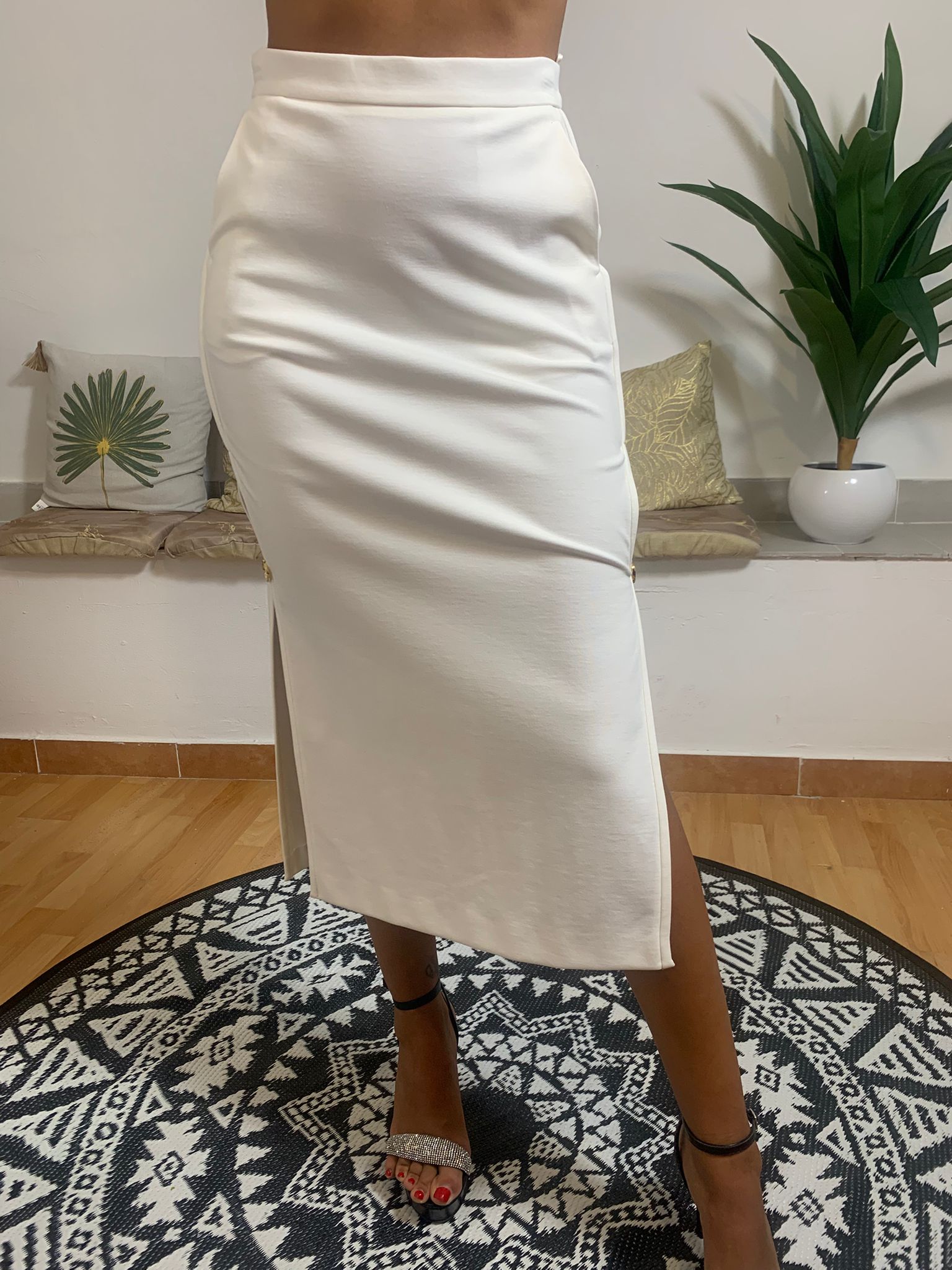 PINKO presenta una raffinata gonna midi dotata di due spacchi laterali profondi, chiusi a metà tramite bottoni dorati. La linea essenziale è arricchita da due tasche laterali e da una zip sul retro per la chiusura. La modella indossa una taglia 40, misura 175 cm ed è pesata 54 kg. Composizione: 67% viscosa, 28% poliamide, 5% elastem.