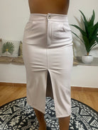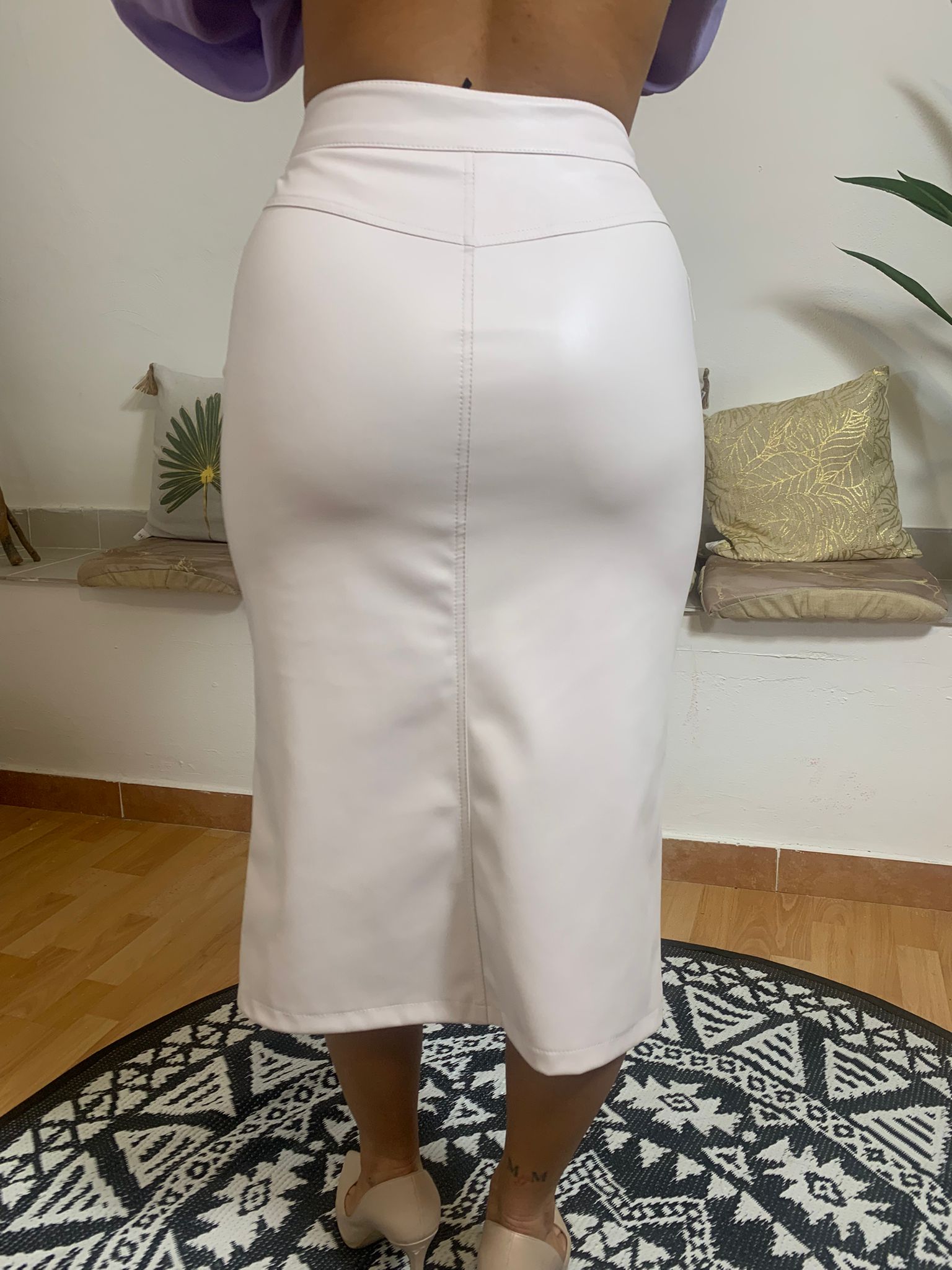 GONNA VICOLO SIMILPELLE. Gonna bianca con spacco frontale, caratterizzata da un design semplice ed elegante. Realizzata in un mix di materiali: 50% poliestere, 50% poliuretanica, 60% acetato e 40% viscosa. La modella indossa una taglia adatta alla sua altezza di 170 cm e peso di 62 kg.
