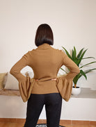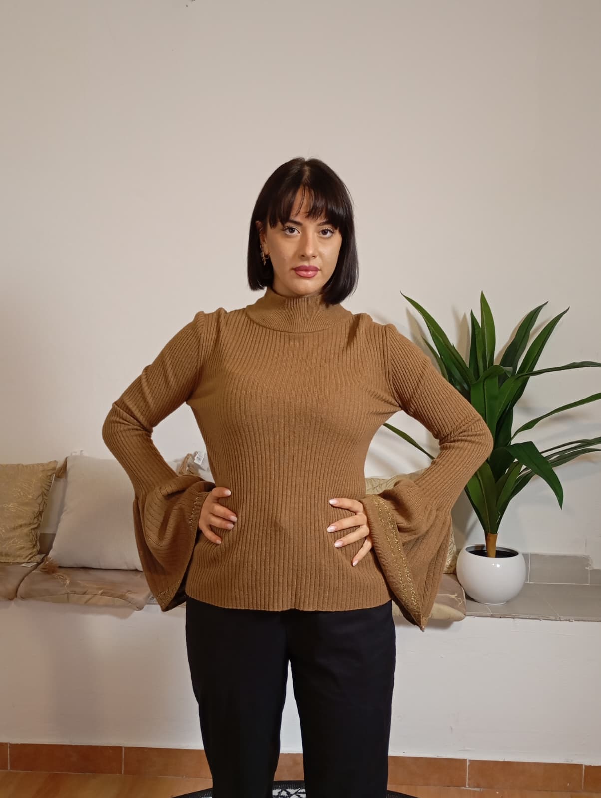 La maglia AlysI presenta un motivo a coste larghe su tutto il corpo, con un collo leggermente alto rifinito a coste più strette. Le maniche a campana sono arricchite da sottili striature dorate sul bordo. Realizzata in un tessuto pregiato composto da 34% poliammide, 31% viscosa, 30% lana e 5% cashmere, unisce comfort e raffinatezza. La modella che indossa il capo è alta 170 cm e pesa 62 kg.