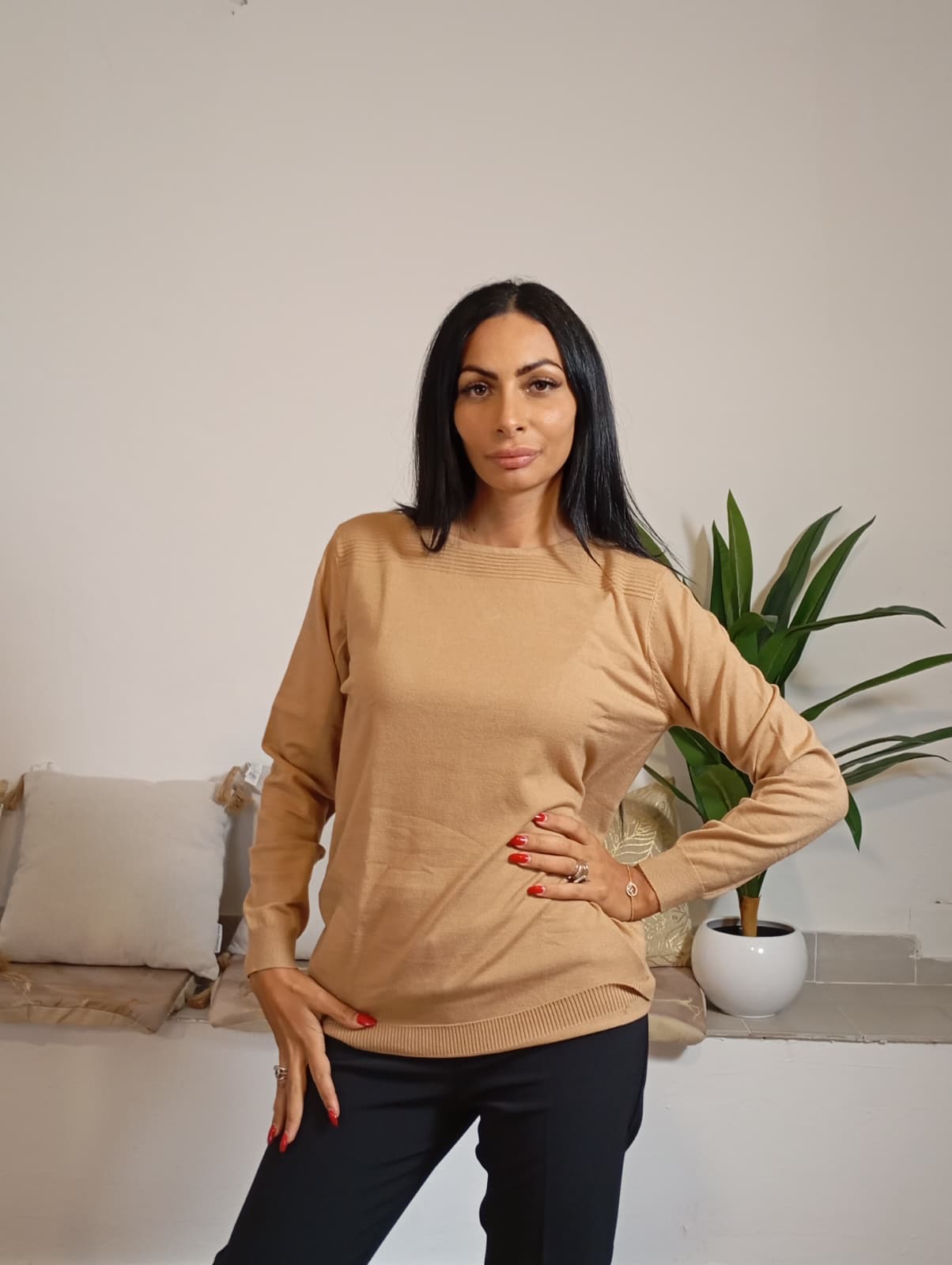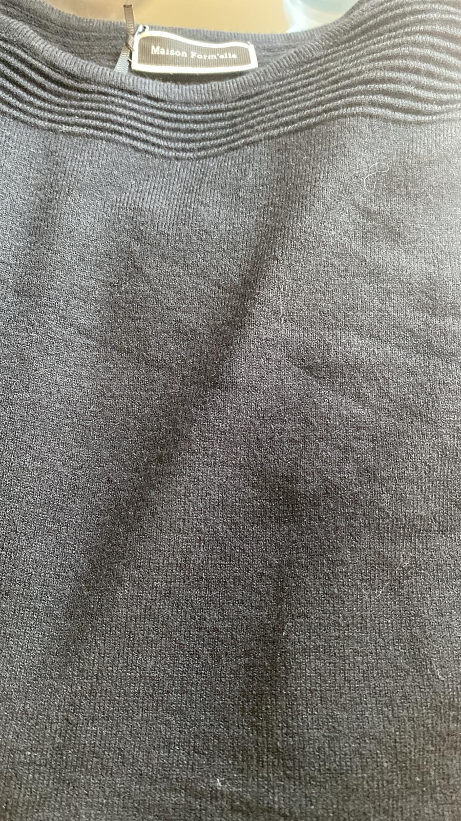 MAISON FORM'ELLE presenta un capo raffinato nel suo design semplice ma distintivo, caratterizzato da uno scollo a barca con sottili costine esclusivamente sul collo. La modella ritratta indossa la taglia 2XL, con un’altezza di 175 cm e un peso di 54 kg. Il tessuto è composto da 50% viscosa, 30% poliammide e 20% poliestere, garantendo un’eccellente combinazione di comfort e durata.