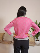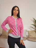 Maglia Sun68 in rosa, caratterizzata da colletto e polsini argento che richiamano le scritte presenti su tutta la superficie. Presenta bottoncini lucidi al centro. Realizzata in 100% lana merino, offre una morbidezza interna e una calda vestibilità. La modella che la indossa pesa 54 kg ed è alta 175 cm.