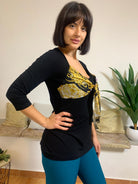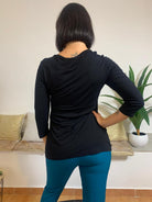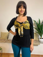Scopri la raffinatezza di questa maglia Clips, un capo che unisce eleganza e praticità. Caratterizzata da un delicato foulard annodiato al seno, crea un effetto sofisticato sul davanti. Le maniche a tre quarti e lo scollo a cuore completano una silhouette femminile e lusinghiera. Realizzata in viscosa al 90% con elastan al 10%, garantisce comfort e morbidezza. Perfetta per chi ricerca un equilibrio tra stile contemporaneo e versatilità quotidiana.