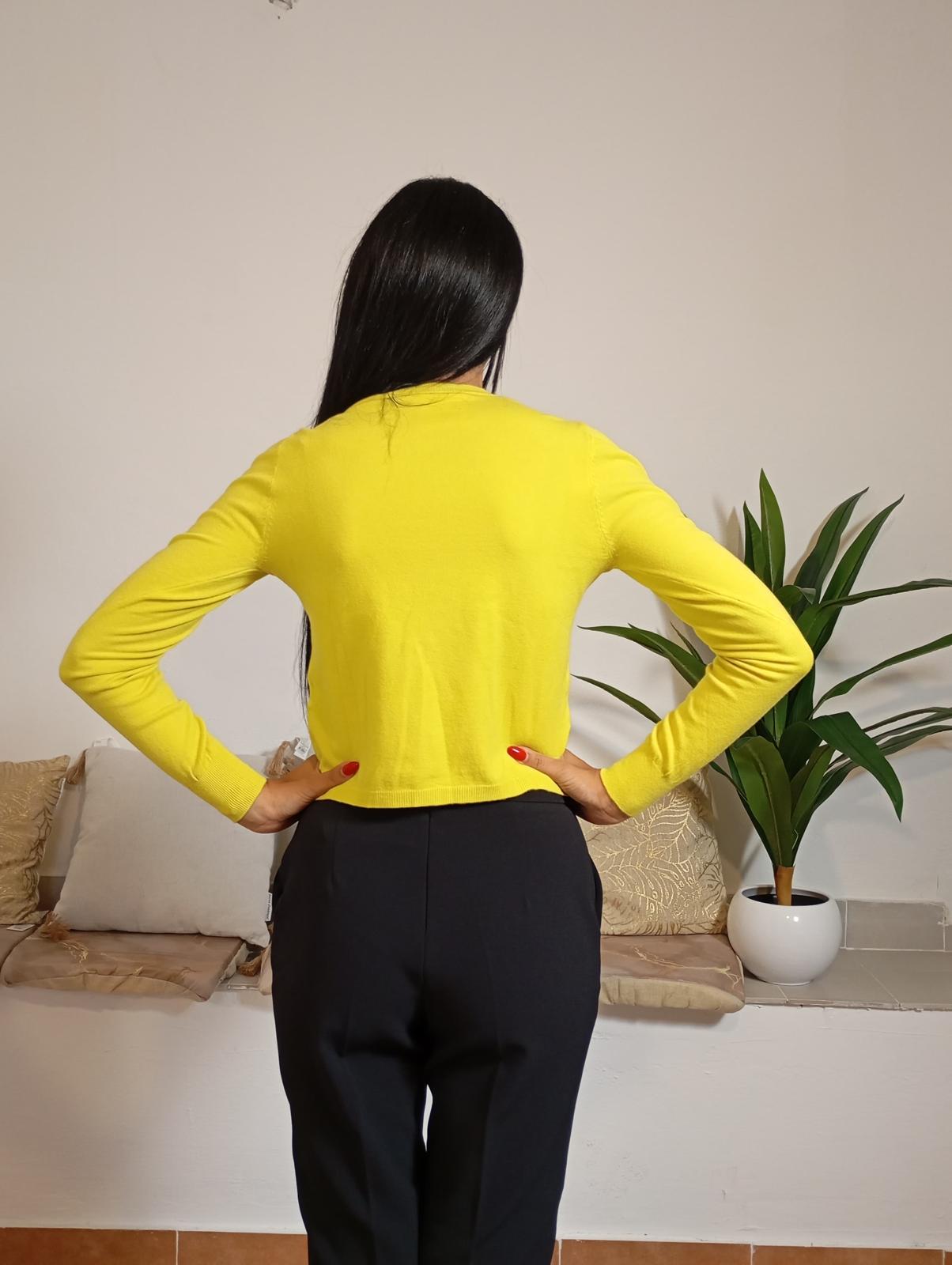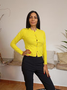 La maglia Kate è un capo morbido e caldo, con una lunghezza che si ferma appena sopra la vita. Con presenza di bottoni che chiudono il capo. Presenta dettagli a costine sulle estremità delle maniche e sul fondo, realizzata in un mix di 50% viscosa, 27% poliestere e 23% nylon. La modella indossa una taglia adatta al suo peso di 54 kg e un’altezza di 175 cm.